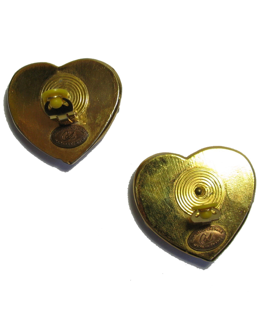 Vintage, Christian Lacroix clip-on earrings, gilded metal heart set with fantasy pearls and rhinestones. The gilding is slightly passed.