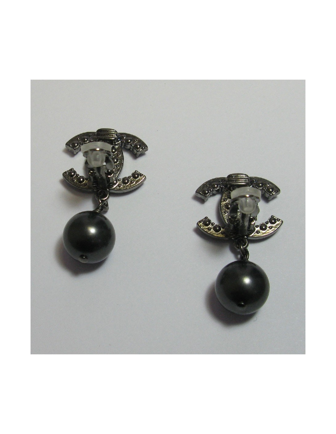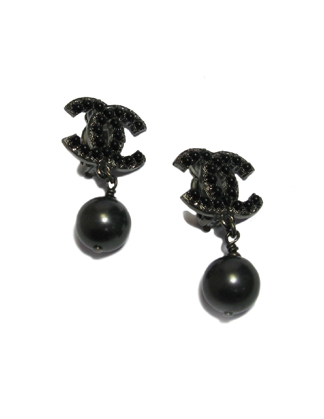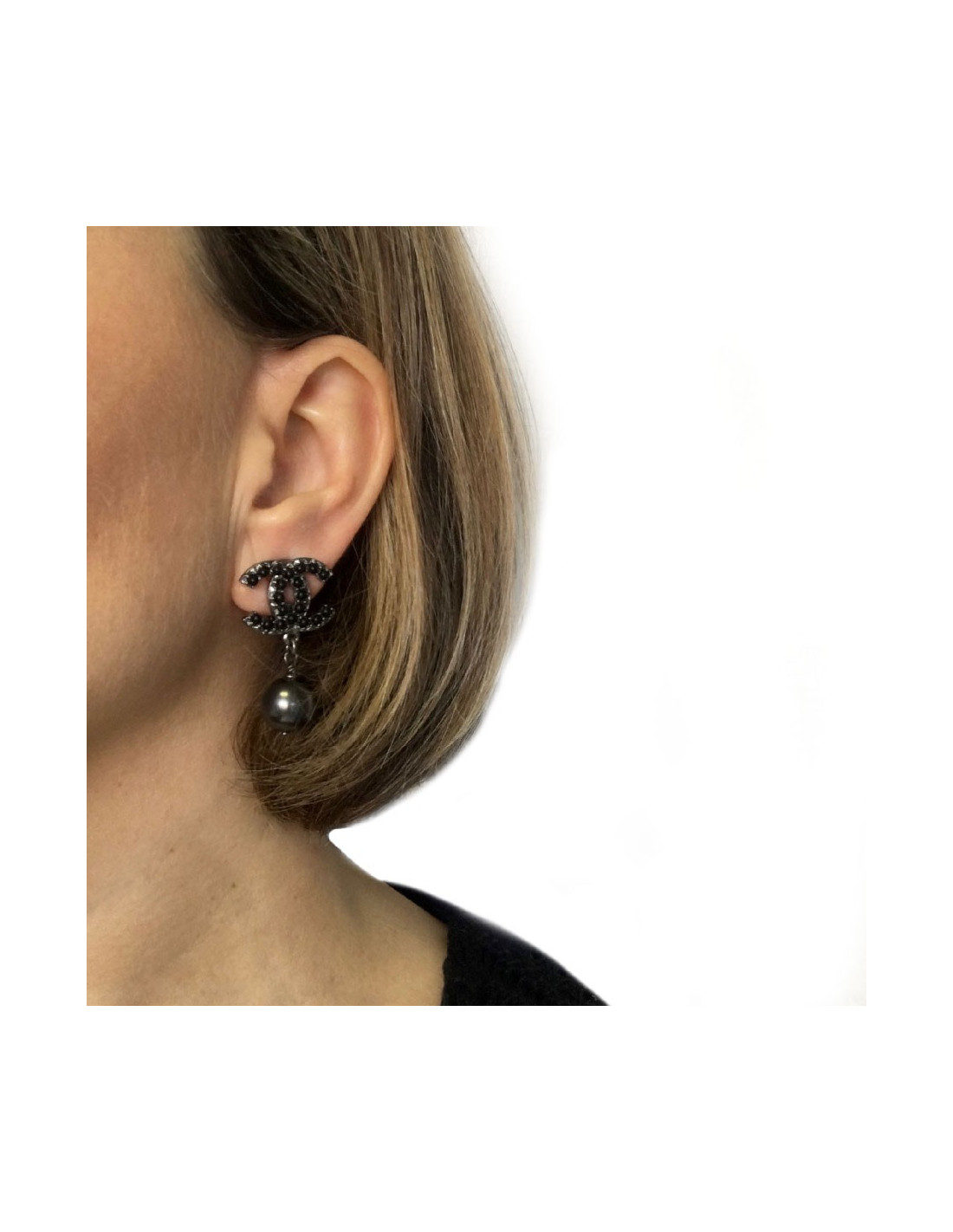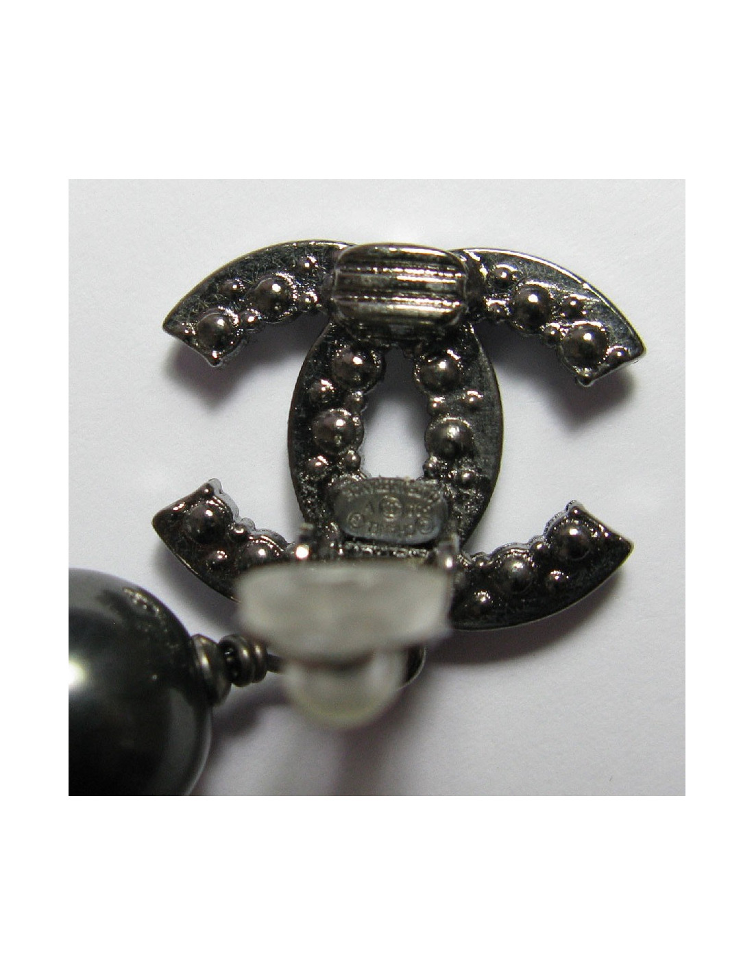 Chanel CC stud earrings in ruthenium metal set with small black pearls and gray pearl bead