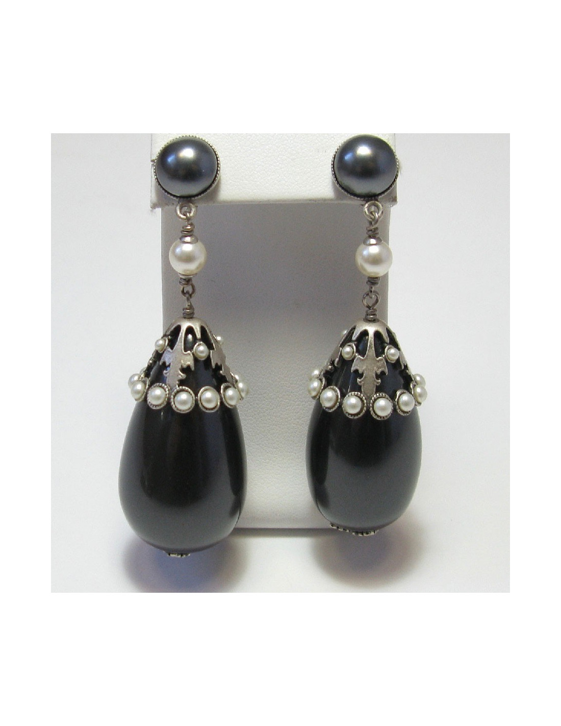 Imposing Chanel clip-on earrings in matte silver metal and pearl gray and white pearls.