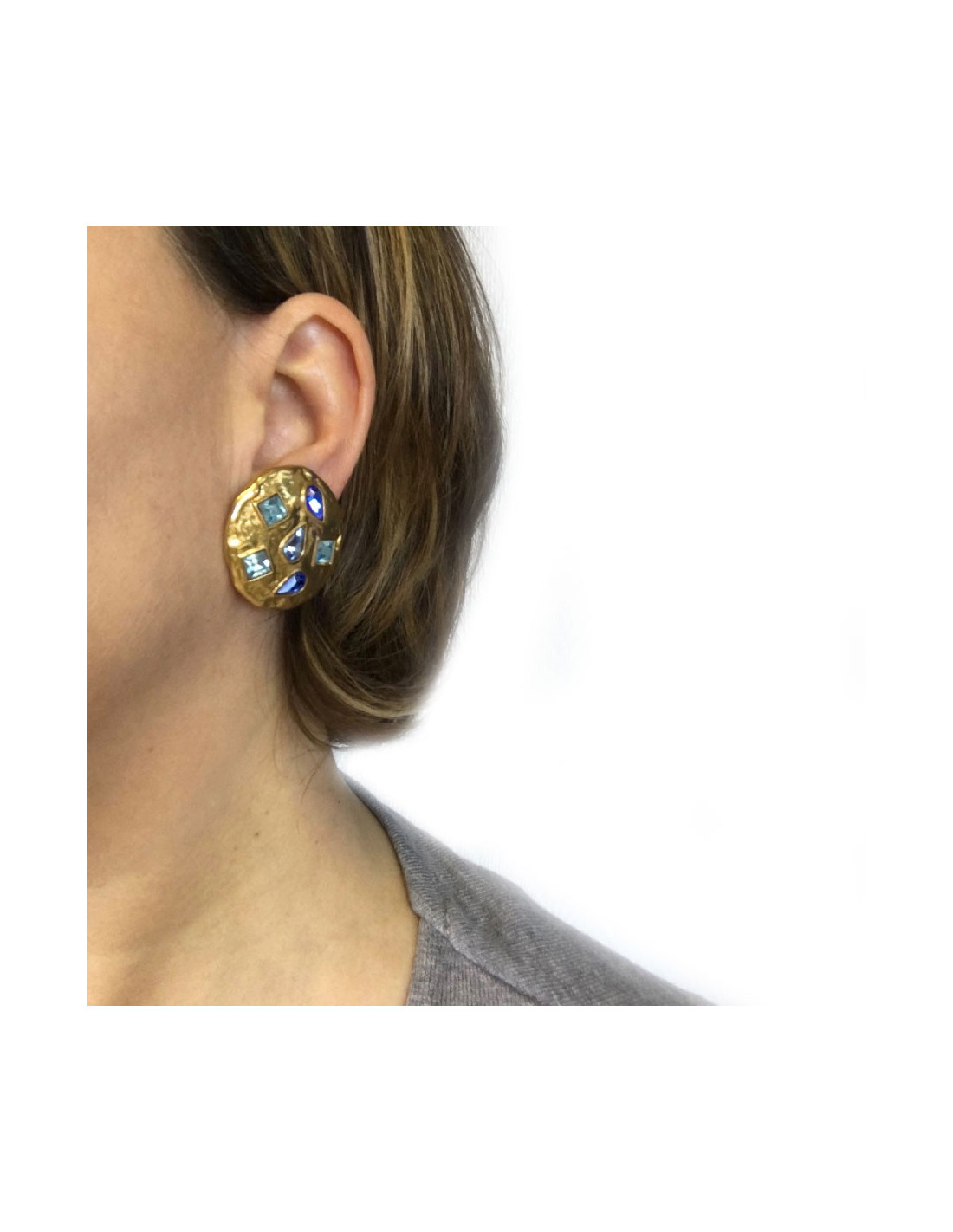YSL SAINT LAURENT round clip-on earrings in gilded metal and blue rhinestones