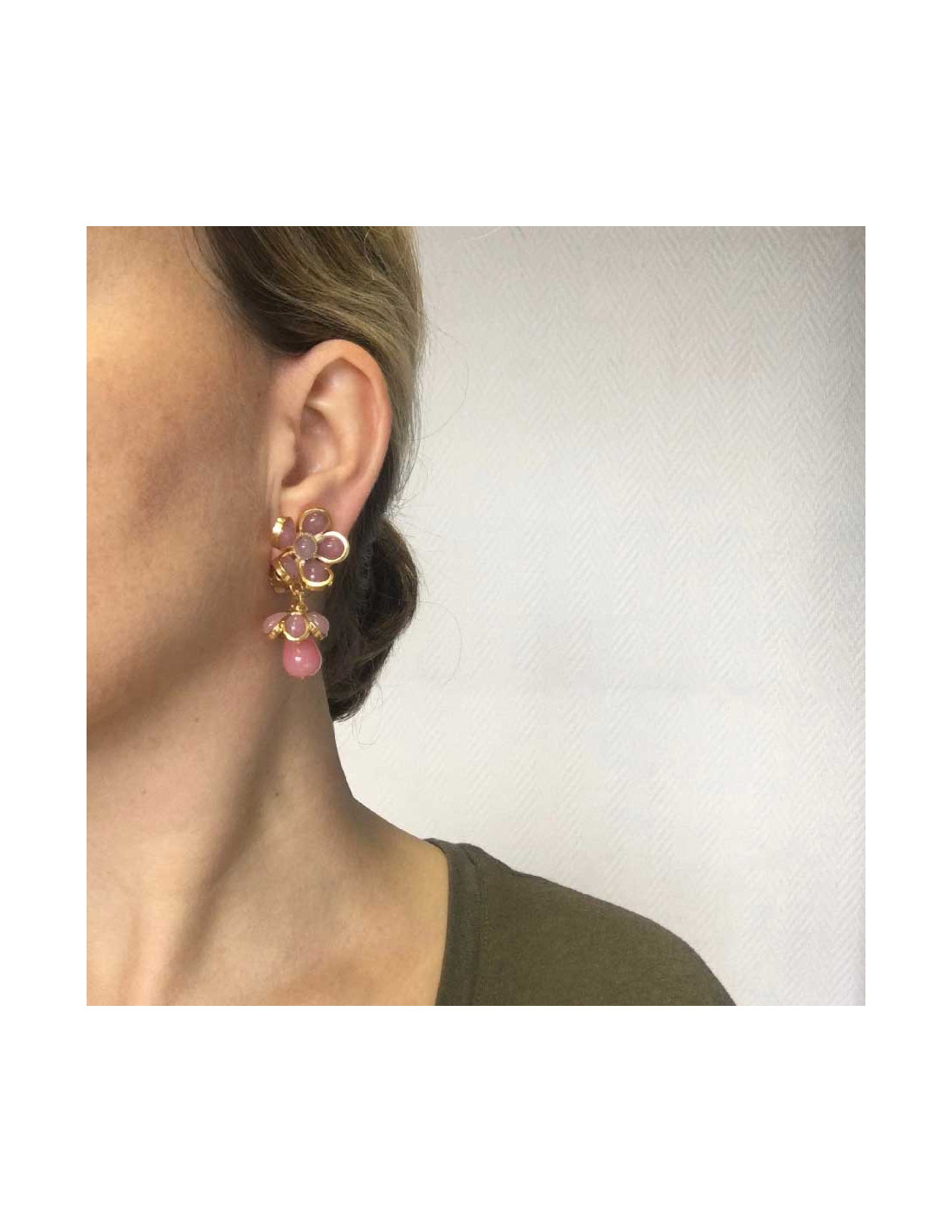 MARGUERITE DE VALOIS pendants pink flowers clip-on earrings in molten glass