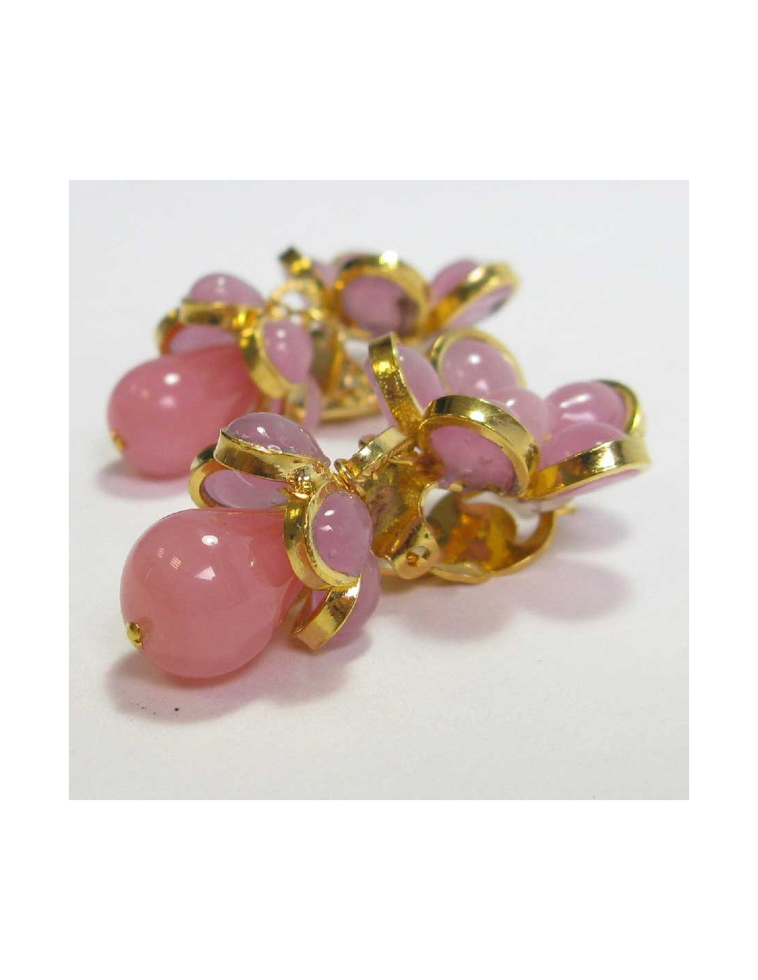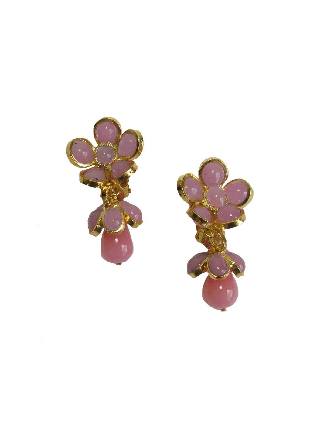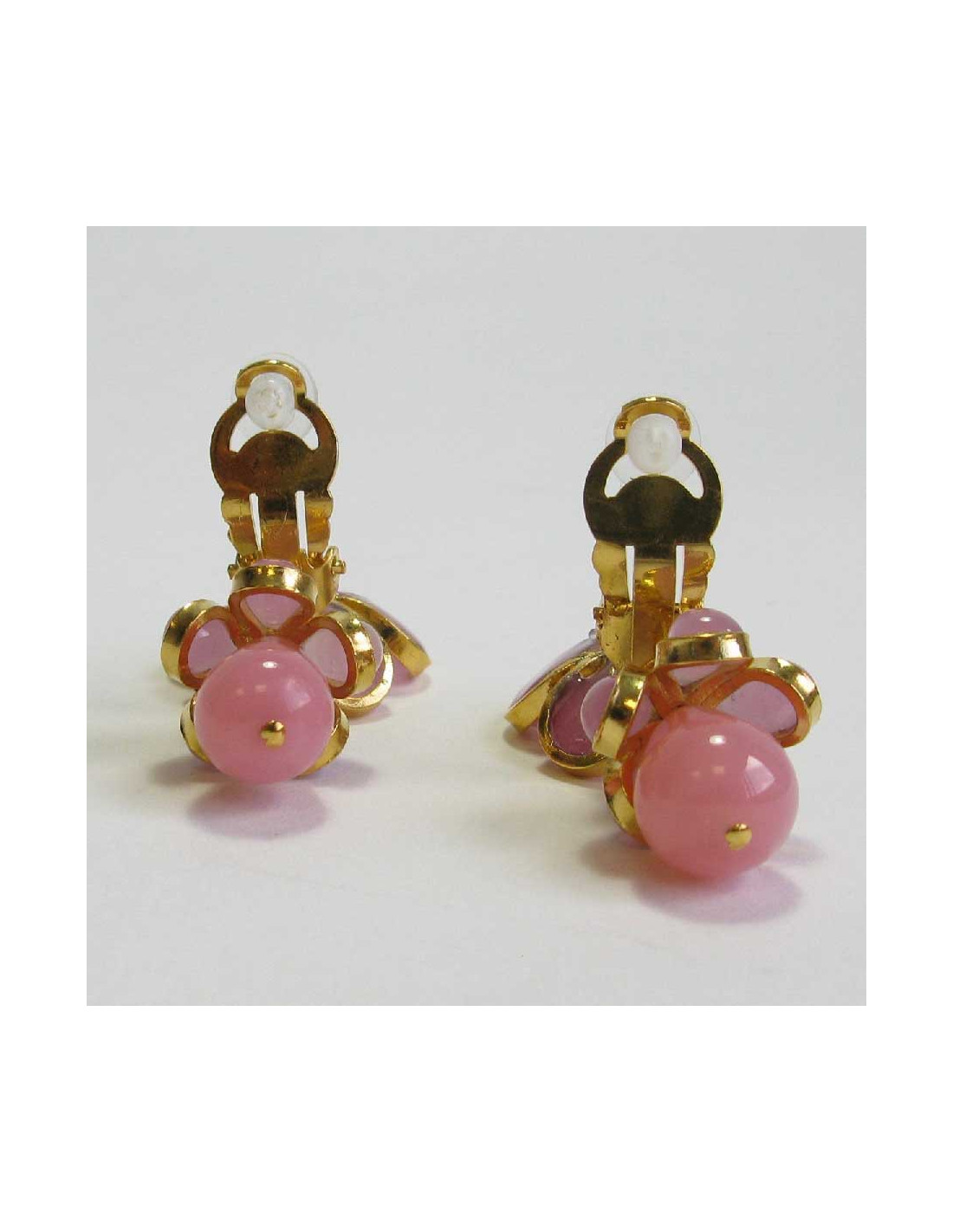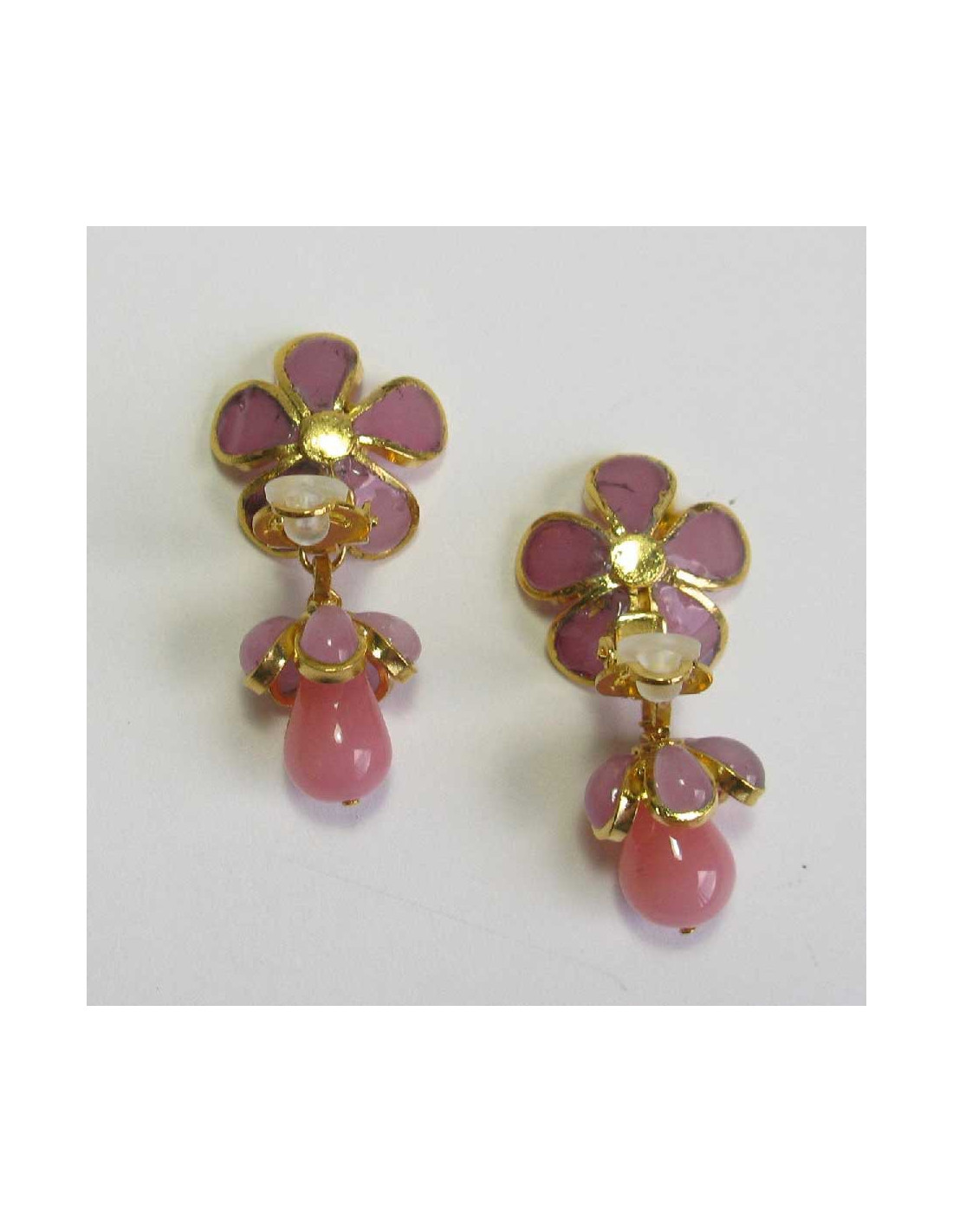 MARGUERITE DE VALOIS pendants pink flowers clip-on earrings in molten glass.