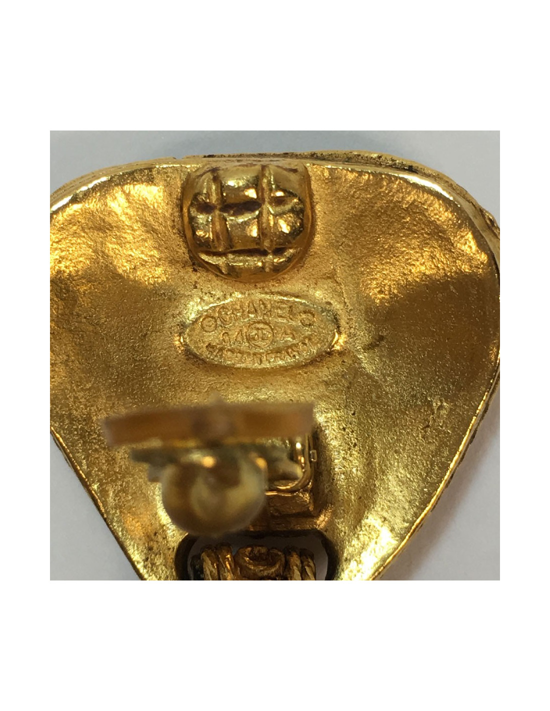 Last items in stock EARRINGS CHANEL vintage square shaped metal and pearl clip-on earrings CHANEL 36075 690.00 € CHANEL vintage square shaped metal and pearl clip-on earrings Condition : very goodMade in FranceMaterials: metal, pearly beadsColors: gold, mother-of-pearlMeasurements : 2.6 x 2.6 cmstamps : yesYear : 1984Details : 4 intertwined CCs with a mother of pearl bead in the center. Add to cart