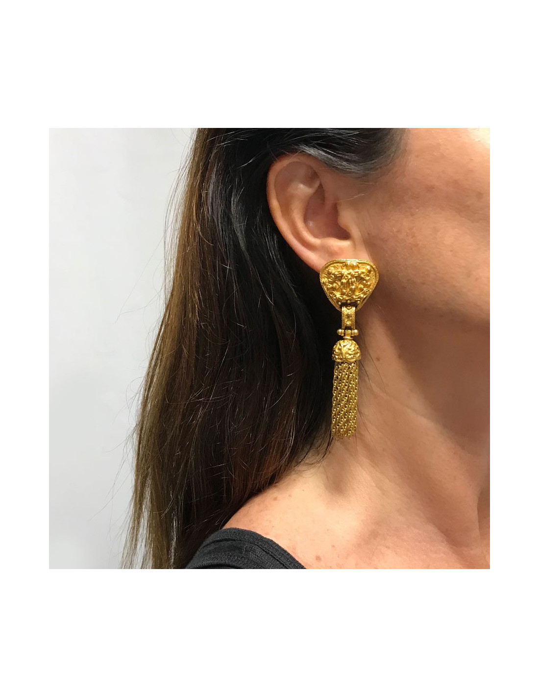 New Last items in stock EARRINGS Yves Saint Laurent vintage rectangle clips SAINT LAURENT 42734 550.00 € Yves Saint Laurent vintage rectangle clips These stunning vintage YSL clip-on earrings are crafted in gold-plated hammered metal. Forming a bold rectangular shape, each clip prominently features the iconic YSL logo. Made in France, they measure 3.5 x 4 cm and are stamped with the brand mark. In very good vintage condition, they show slight signs of wear... Add to cart