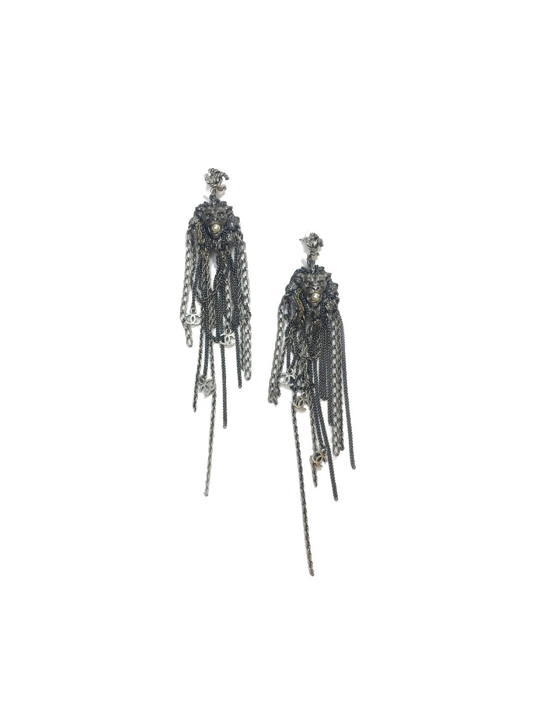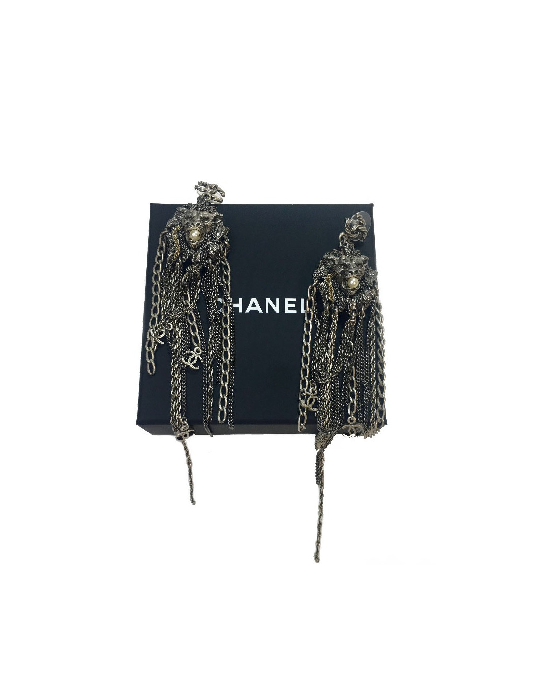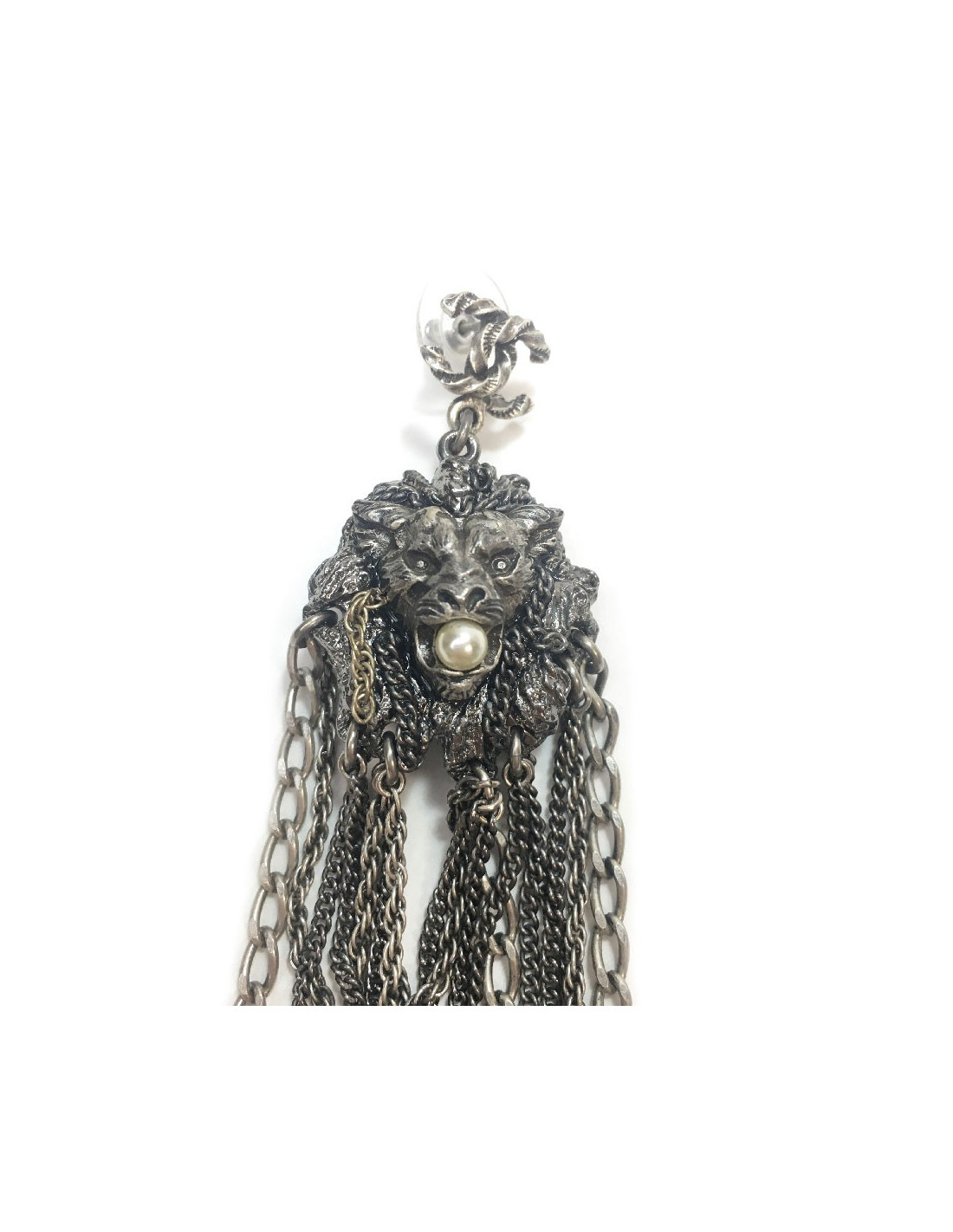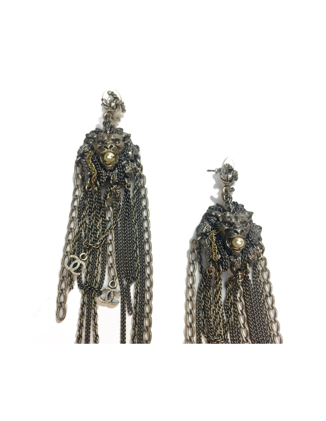 Beautiful Chanel dangle earrings from 'Métiers d'Art' Paris Venice 2009. Multi silver and gold chains, a lion's head set with a pearly pearl.
