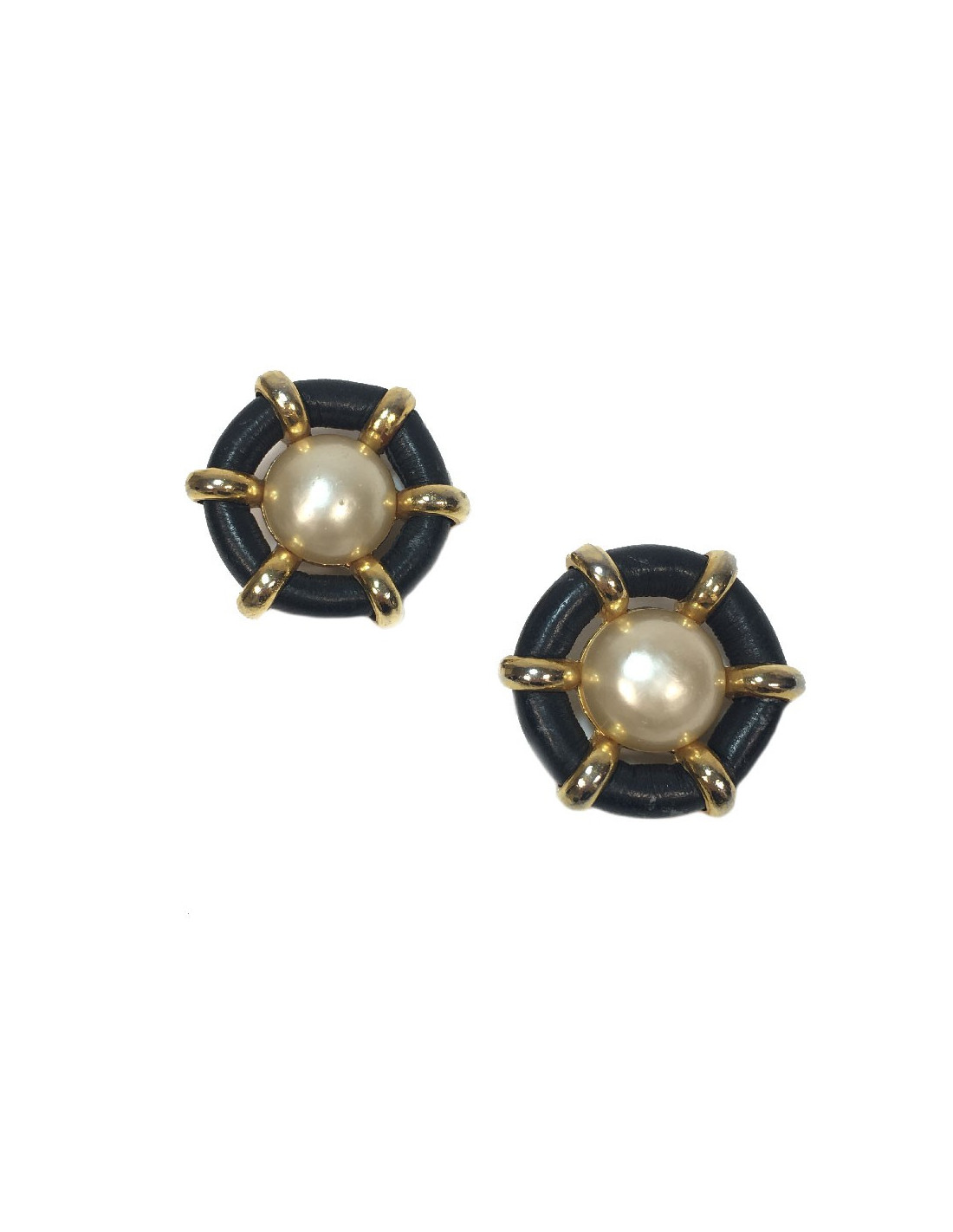 Chanel clip-on earrings in black faux leather, gold metal and mother-of-pearl in the center.