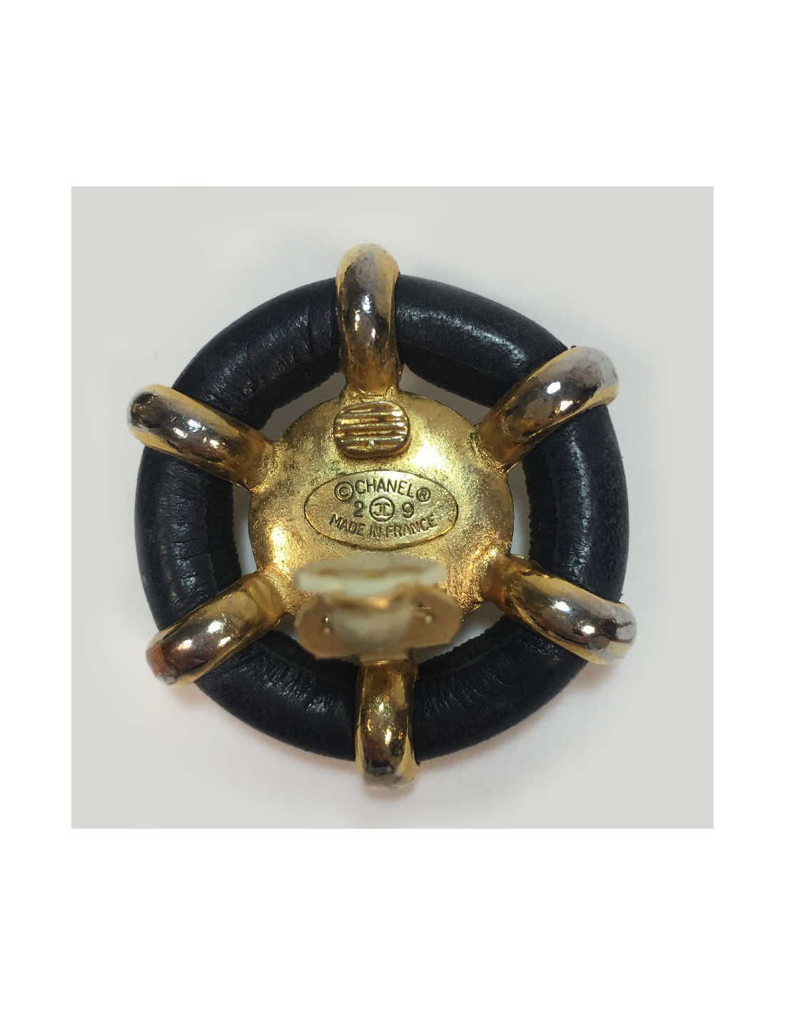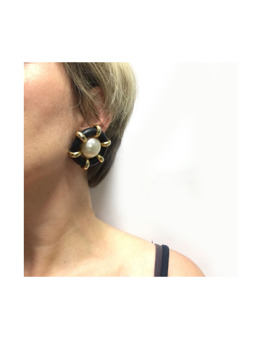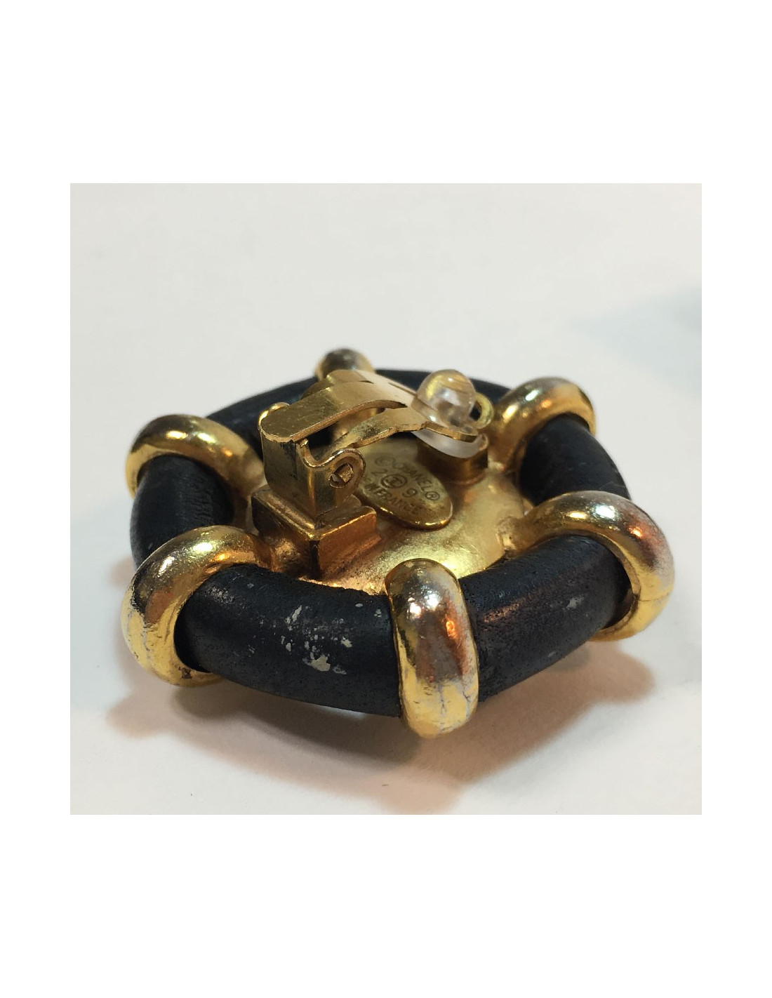 Chanel clip-on earrings in black faux leather, gold metal and mother-of-pearl in the center