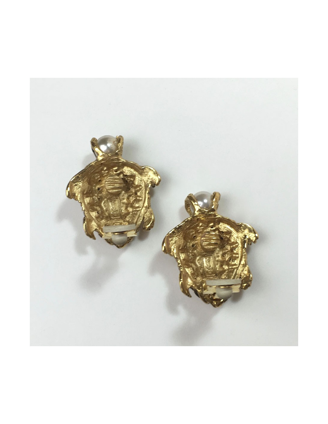 Details: Yves Saint Laurent YSL turtle clip earrings in gilded metal, pearly beads and rhinestones.