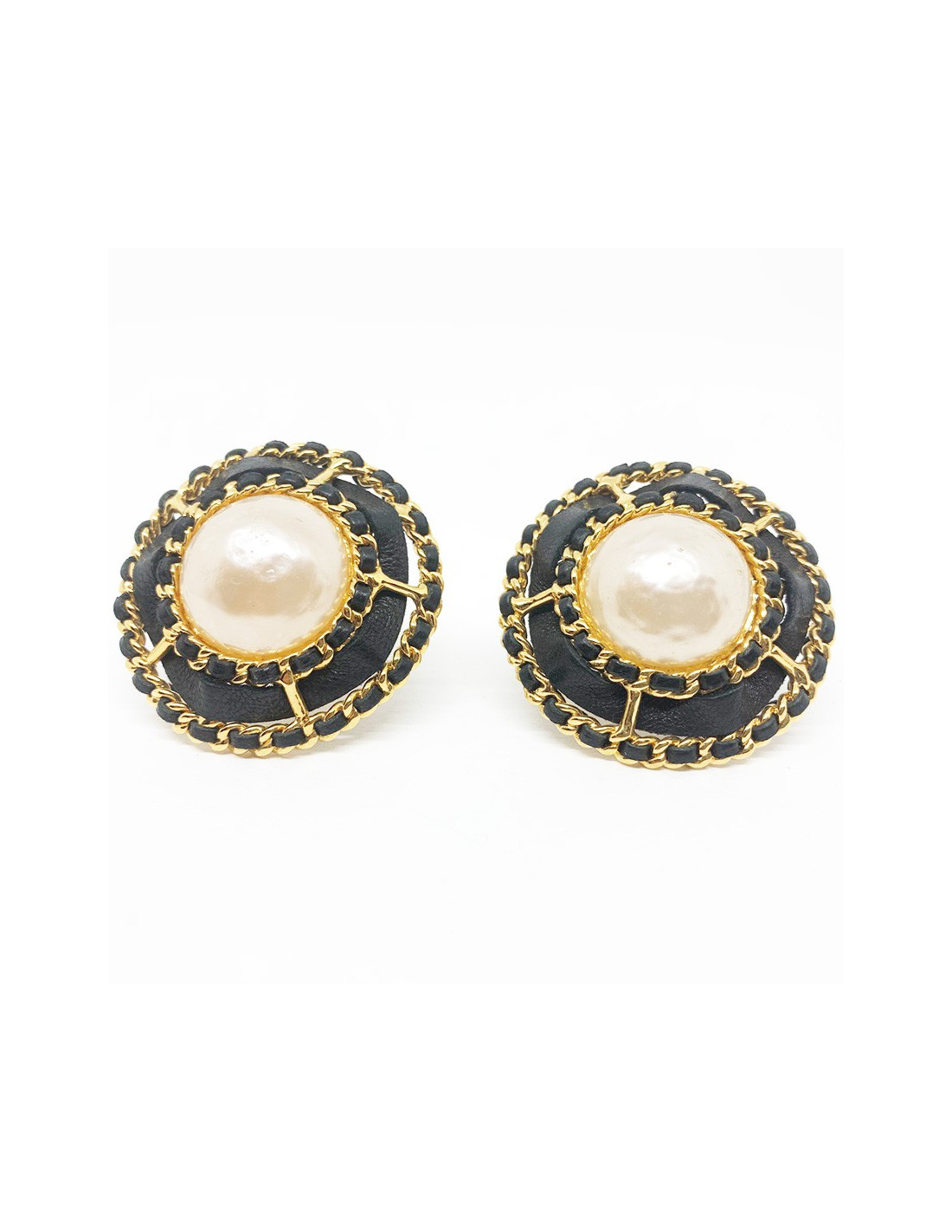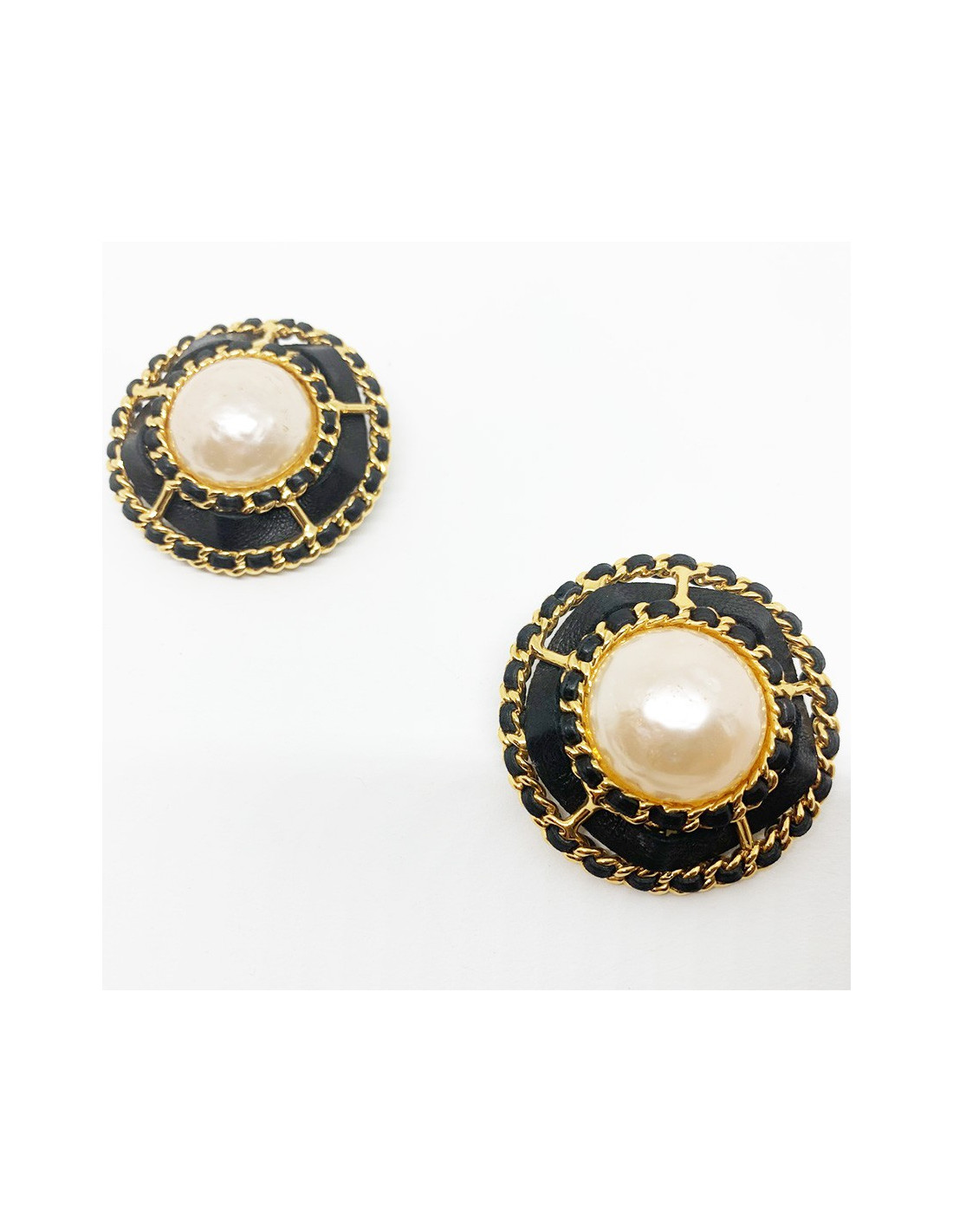 Ultra vintage: Collector's jewelry. This CHANEL earrings are vintage and represent the very essence of the brand. A pearly ball encircled by the traditional assembly of golden chain and black leather.