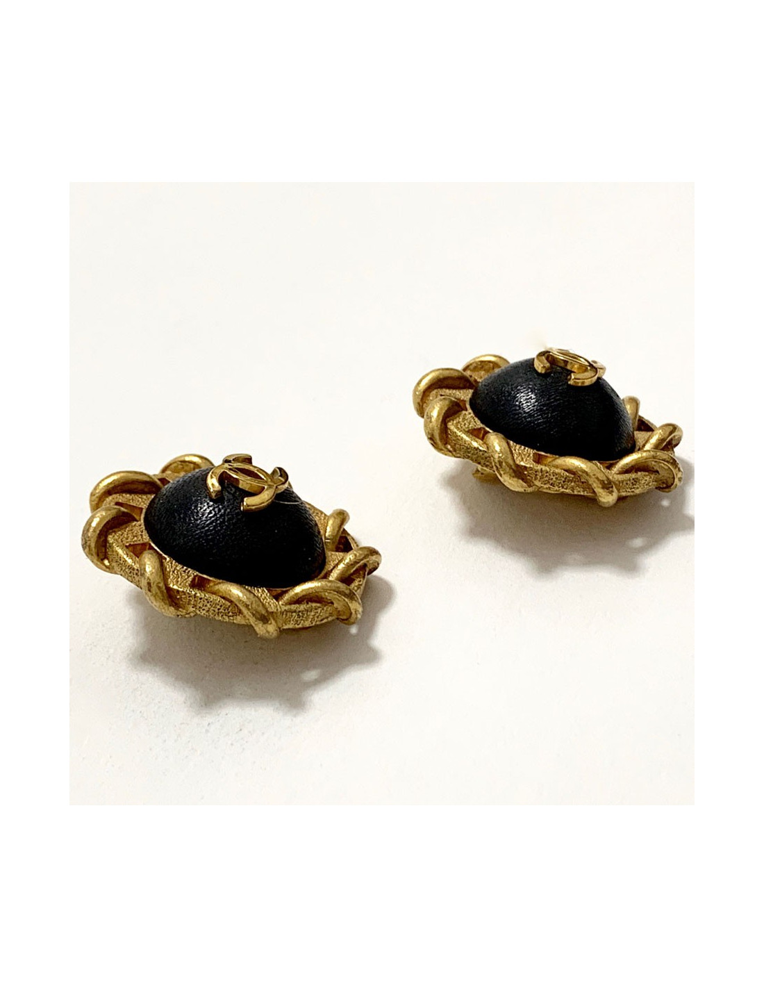 Last items in stock EARRINGS CHANEL vintage square shaped metal and pearl clip-on earrings CHANEL 36075 690.00 € CHANEL vintage square shaped metal and pearl clip-on earrings Condition : very goodMade in FranceMaterials: metal, pearly beadsColors: gold, mother-of-pearlMeasurements : 2.6 x 2.6 cmstamps : yesYear : 1984Details : 4 intertwined CCs with a mother of pearl bead in the center. Add to cart