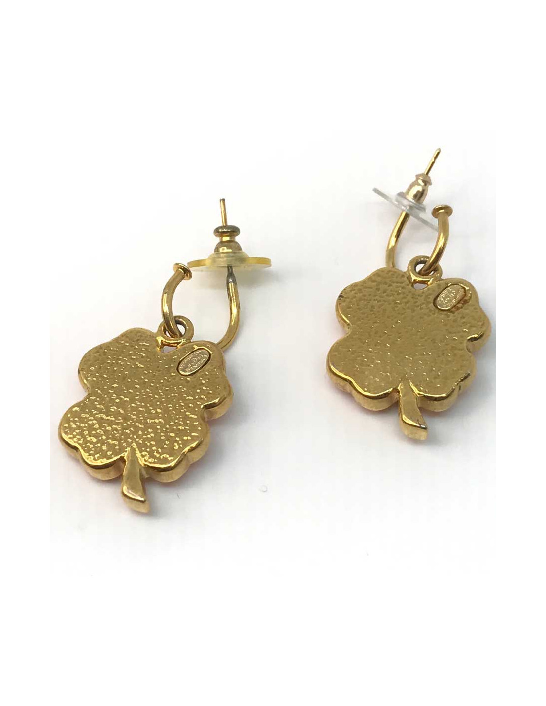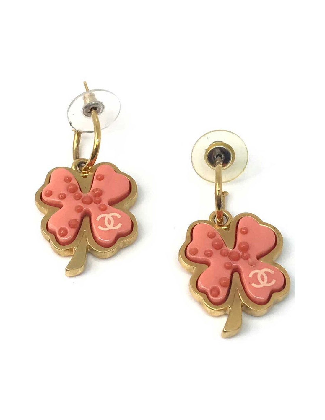 The earrings come from Maison CHANEL. Each represents a clover with four pink leaves. We find the CC emblem on each of them, as well as small dark pink dots in the heart of each clover.