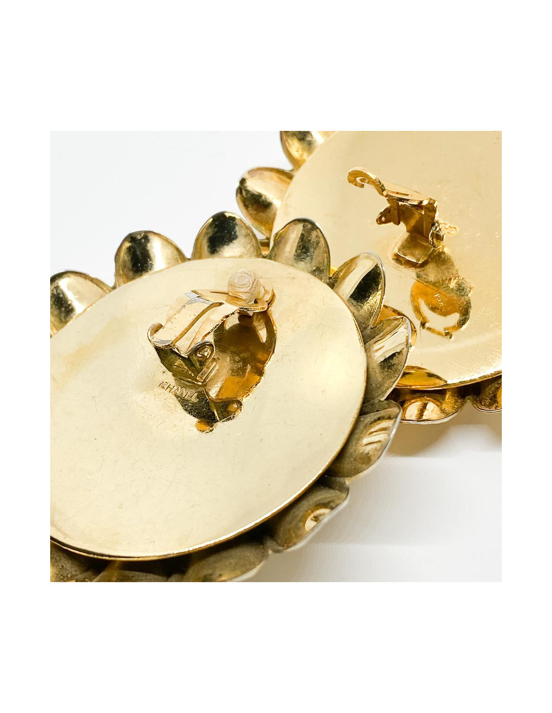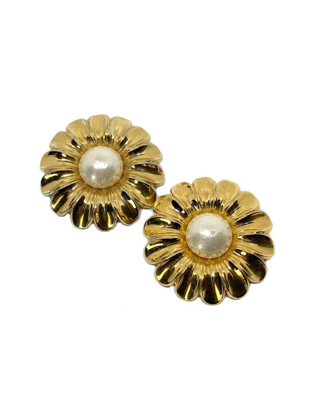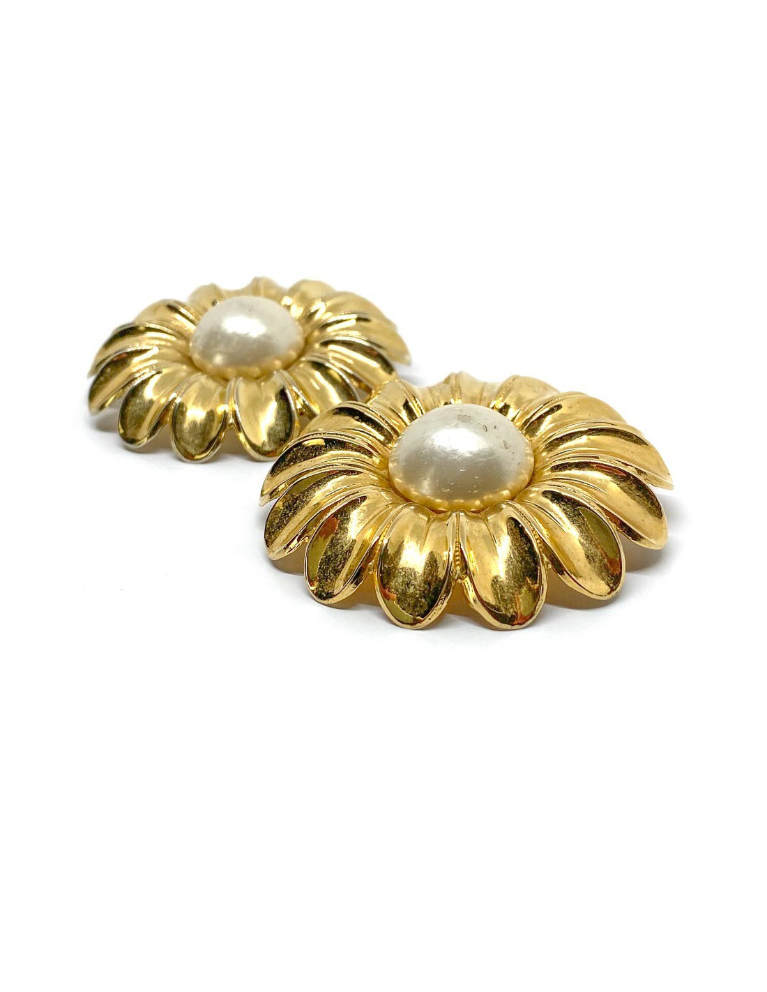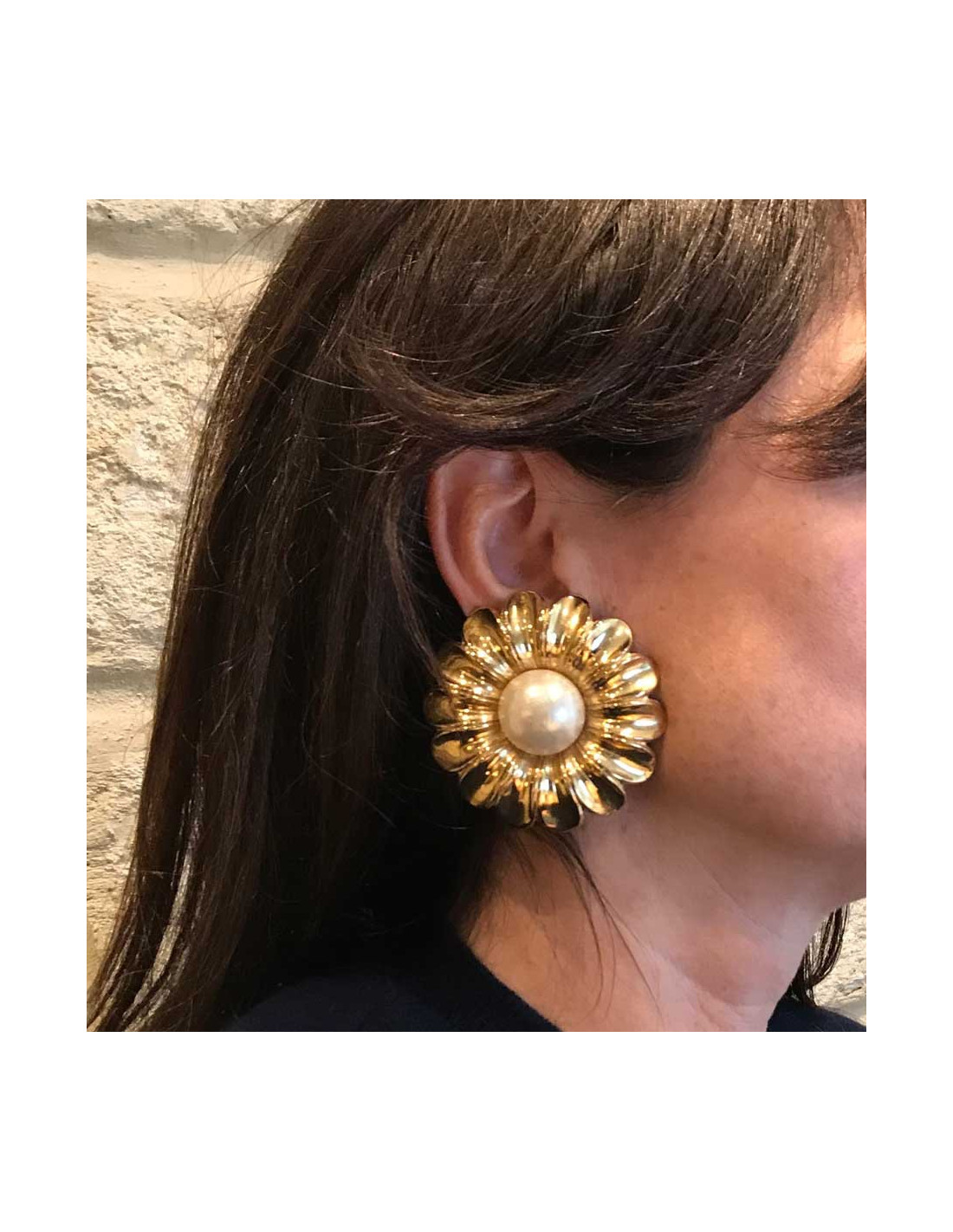 Details : Clip earrings from the 80s, each representing an imposing daisy, with fine-gold petals and a pearly daisy in the heart. A rare collector's item. They are in good condition. We note a chip on each of the pearly hearts with very faint micro-scratches.