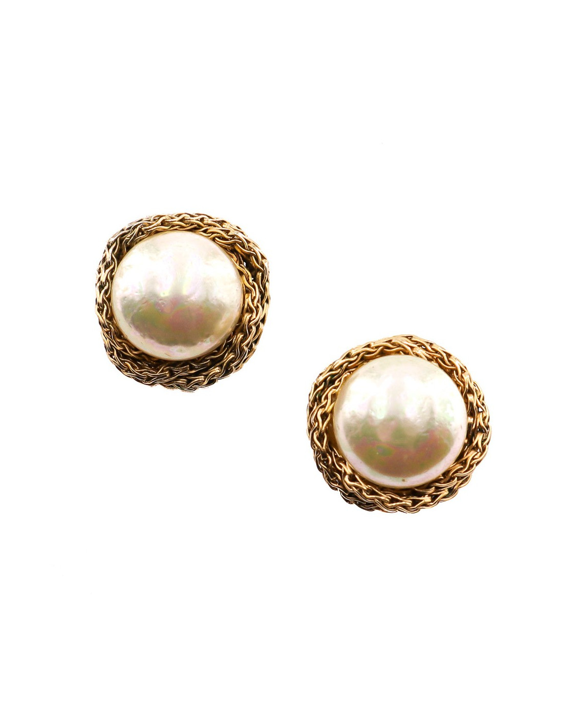 Sold EARRINGS CHANEL Couture Vintage pearl clip-on earrings CHANEL 33419 800.00 € CHANEL Couture Vintage pearl clip-on earrings Condition : very goodMade in FranceModel : clip-on earringsMaterials : metal, pearly beadsColor : mother-of-pearlHardware: goldMeasurements : Diameter 2,5 cmDetails : in the center a pearly half-pearl, surrounded by two interlaced stirred chains View