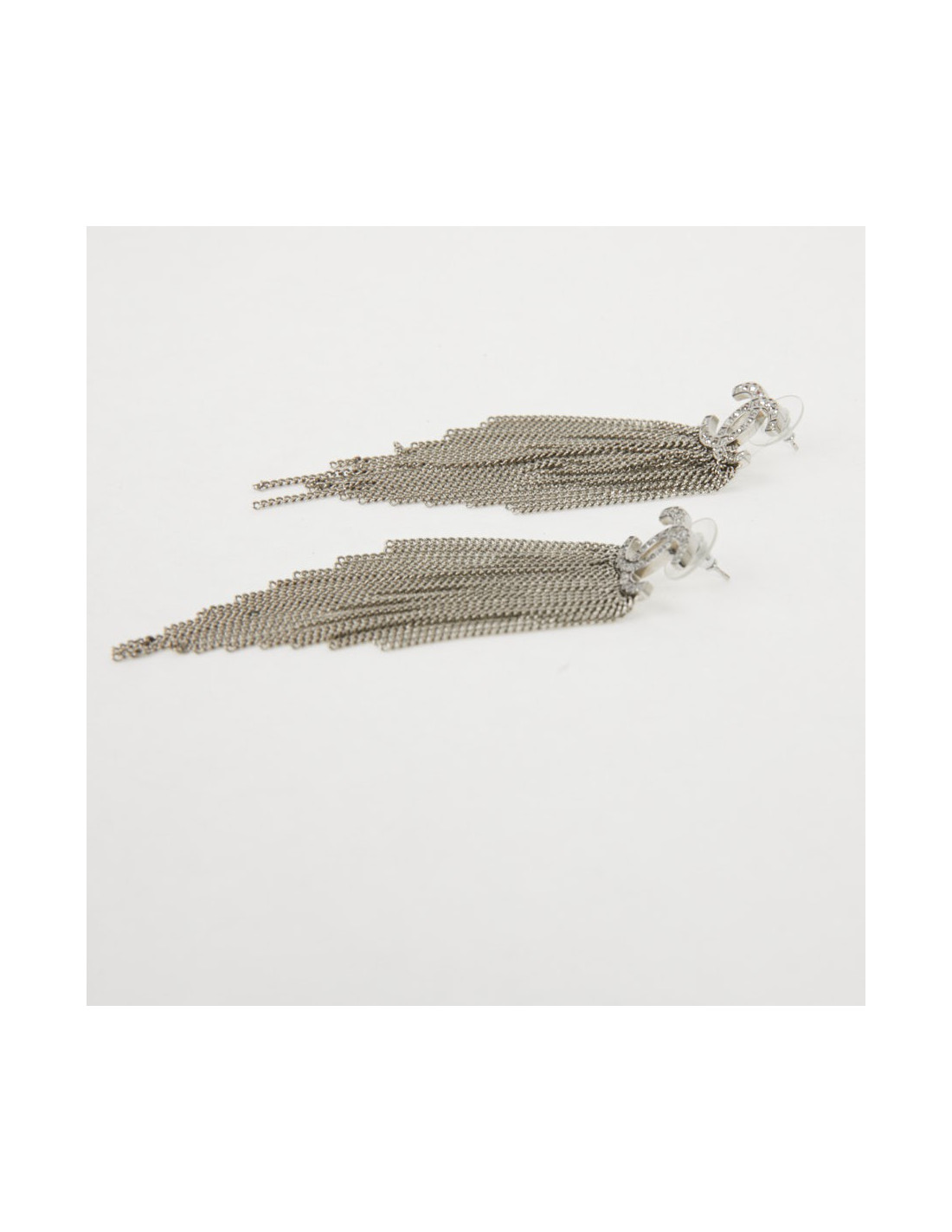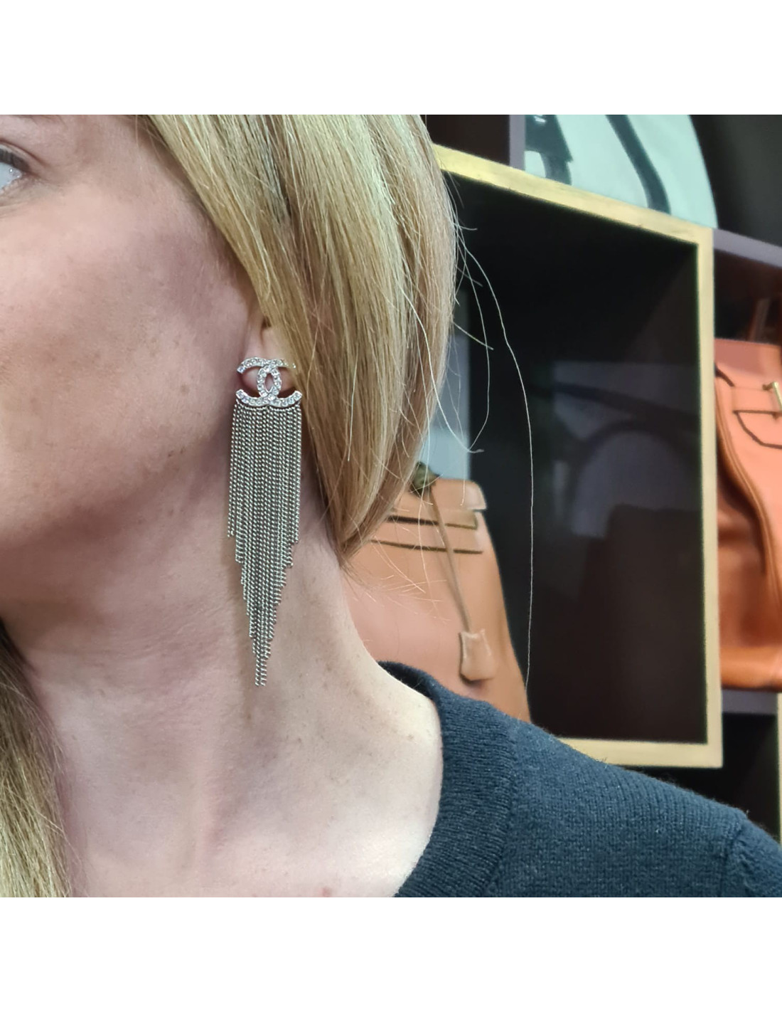 These Chanel CC earrings are made of silvery metal. The double C are in round and square rhinestones. Many chains are hanging. At the back of each buckle is the hallmark. They have never been worn.