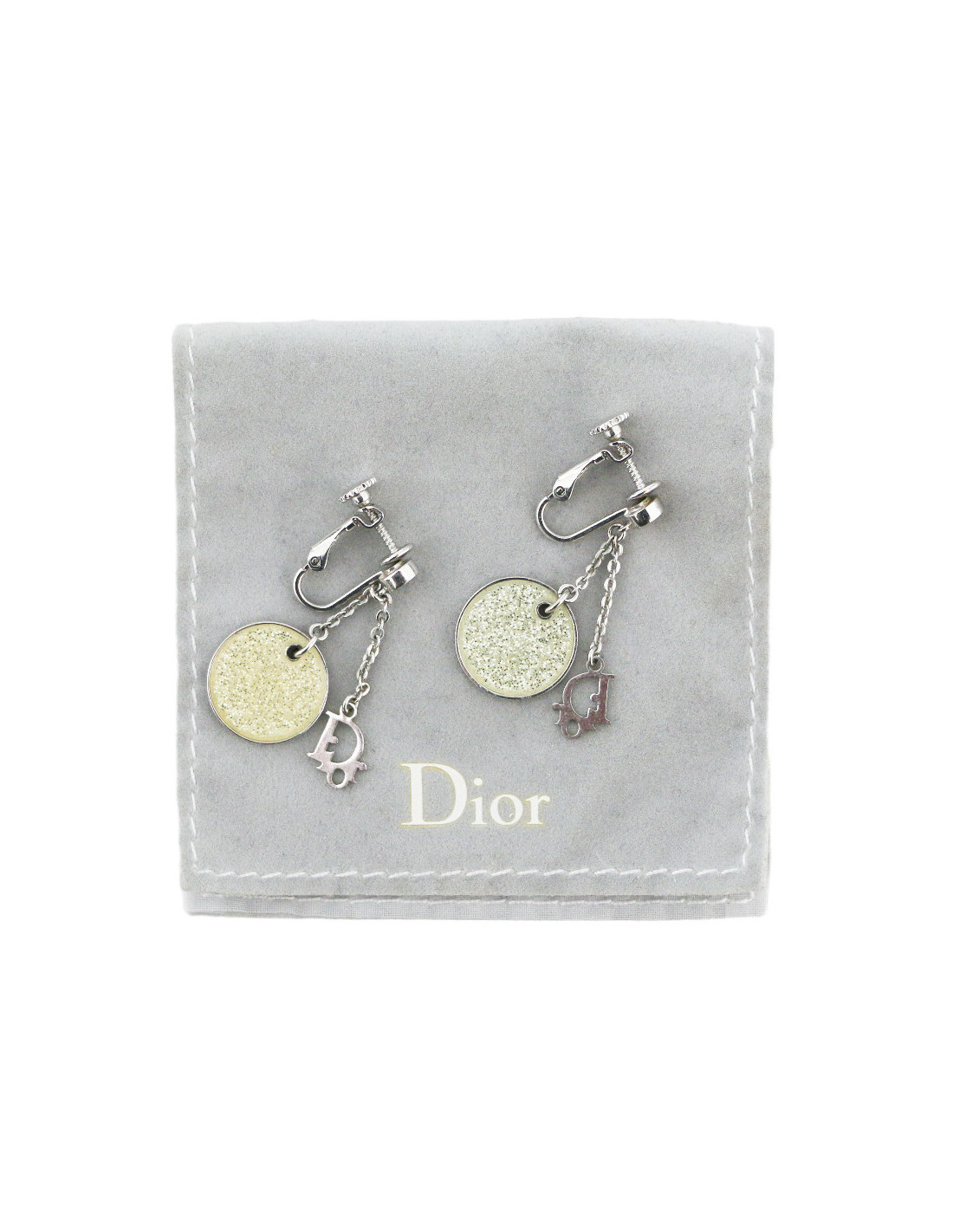 Details :DIOR charms and transparent pearl with silver glitter. Clip-on earrings, adjustable with a screw.