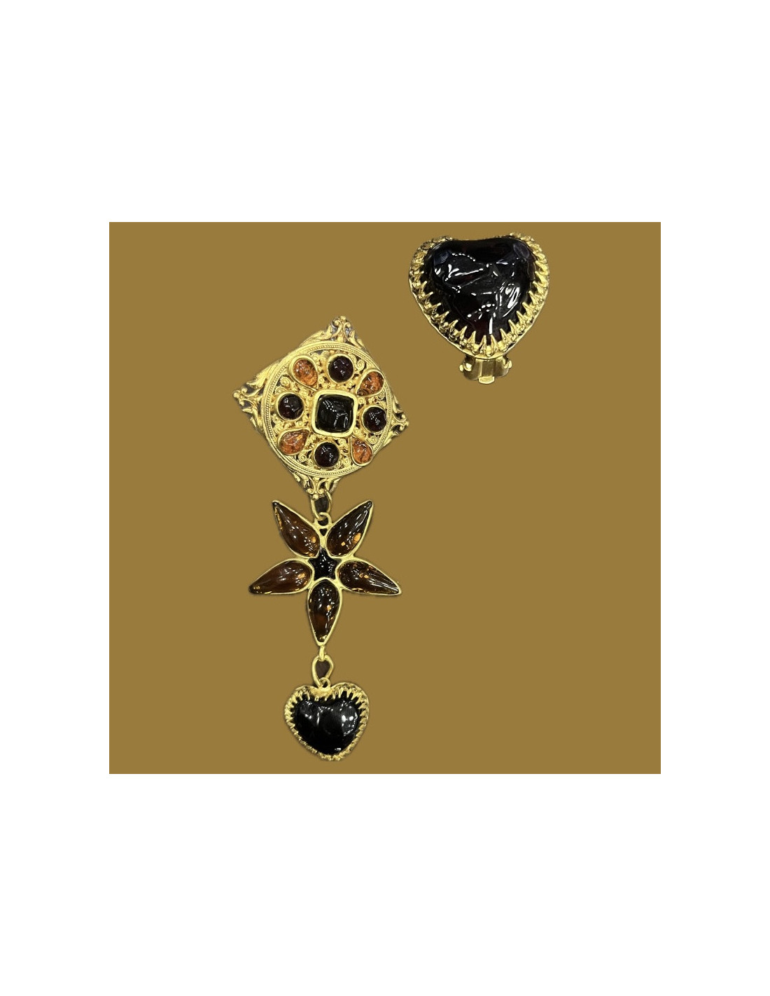Last items in stock EARRINGS ISABEL CANOVAS coral clip-on earrings ISABEL CANOVAS 24238 390.00 € ISABEL CANOVAS coral clip-on earrings Condition: good (faded gilding)Materials: resin, metalColors: gold, coralMeasurements: length 6.4cm, width 2.4cmDetails: Imposing Isabel Canovas ear clips in gold resin and imitation coral resin. The gold has faded in places. Delivered in a Valois Vintage Paris dustbag Add to cart