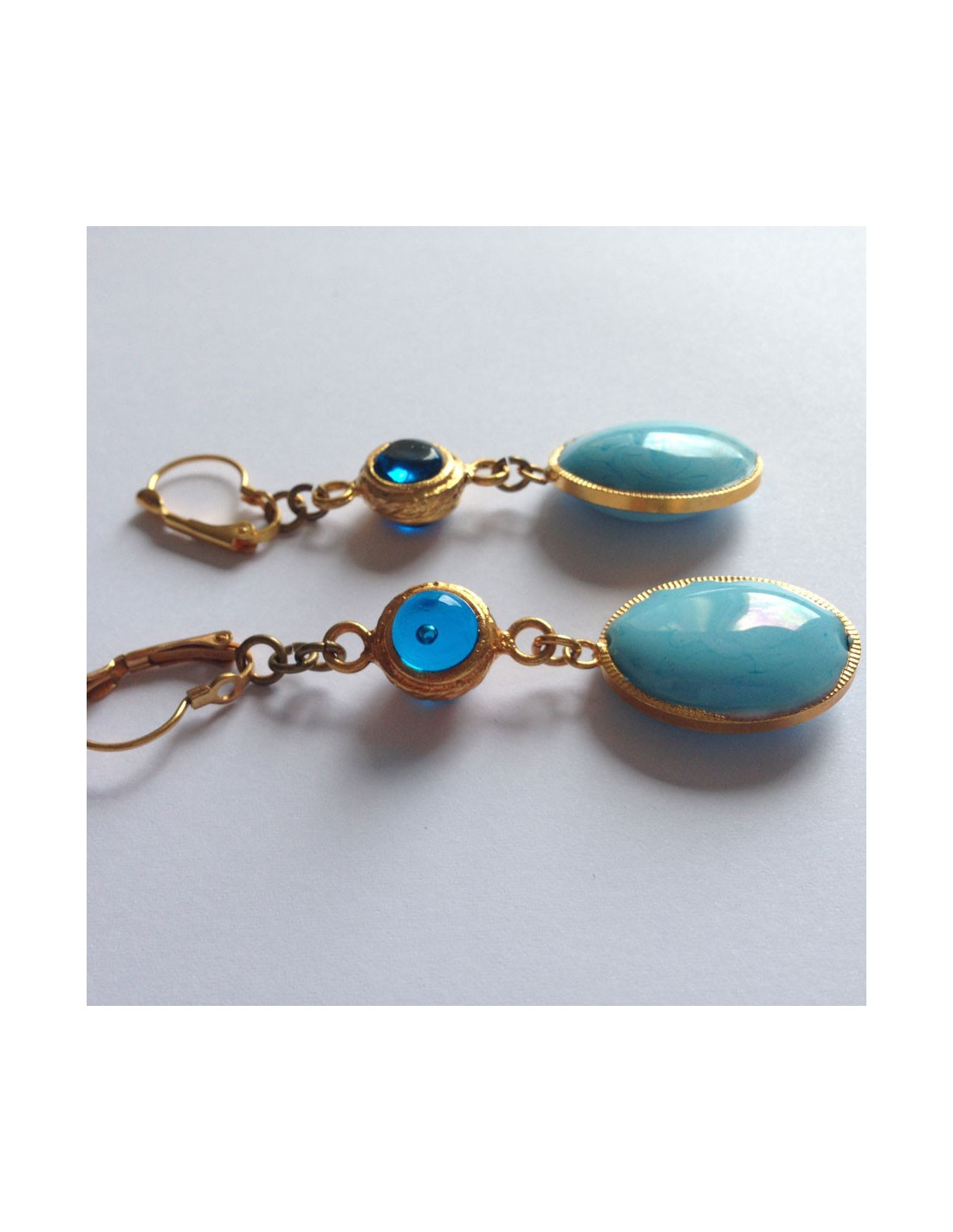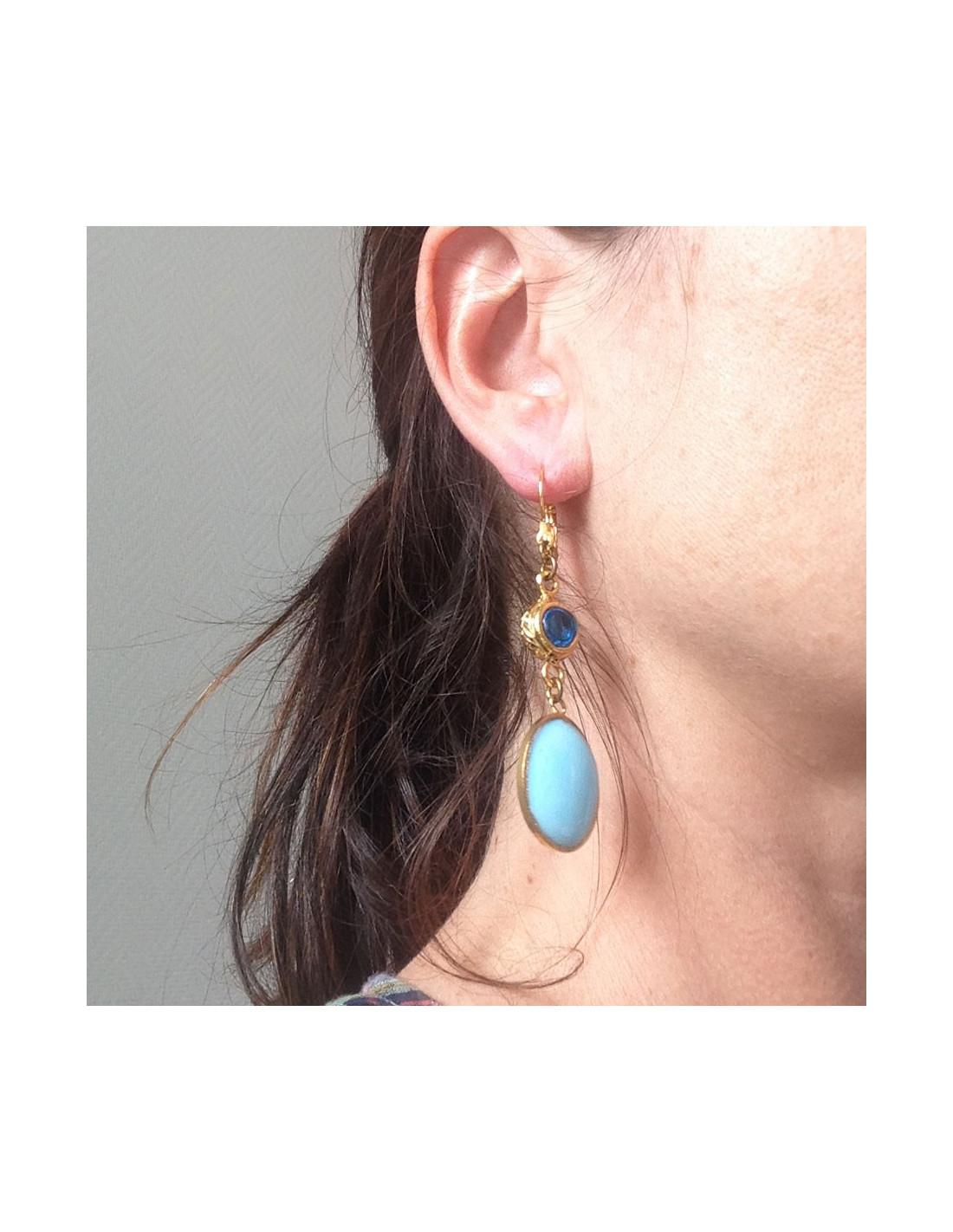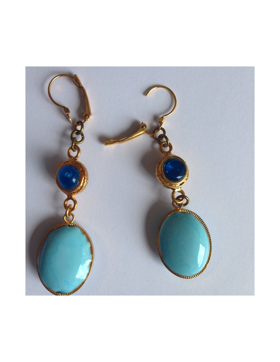 Marguerite de Valois consisting of a blue oval ear studs gilded opaque layette glass embellished with a round of transparent blue glass & metal end