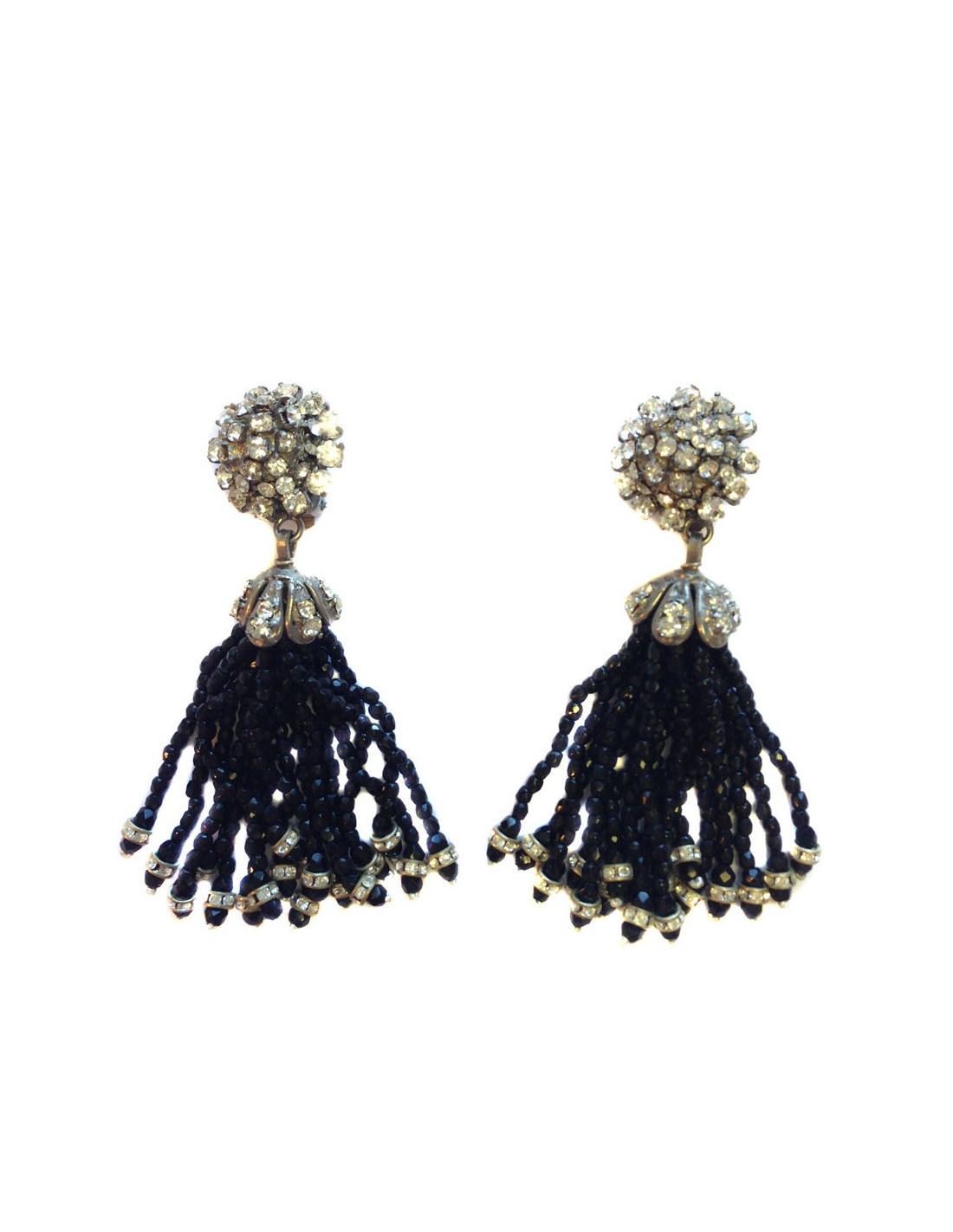 Very nice pair of ear pendants CHANEL clips. Rose swarovski rhinestones and tassels of small faceted black pearls completed by a small seam ring of small swarovski rhinestones. Collection of the 1990s in very good condition.