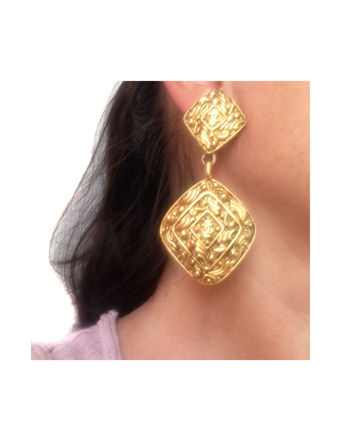 Couture! Very nice pair of CHANEL pendant clip-on earrings, vintage, in gilded metal. The clips consist of two pieces, cut in the shape of diamonds, having floral details and a CC in the center