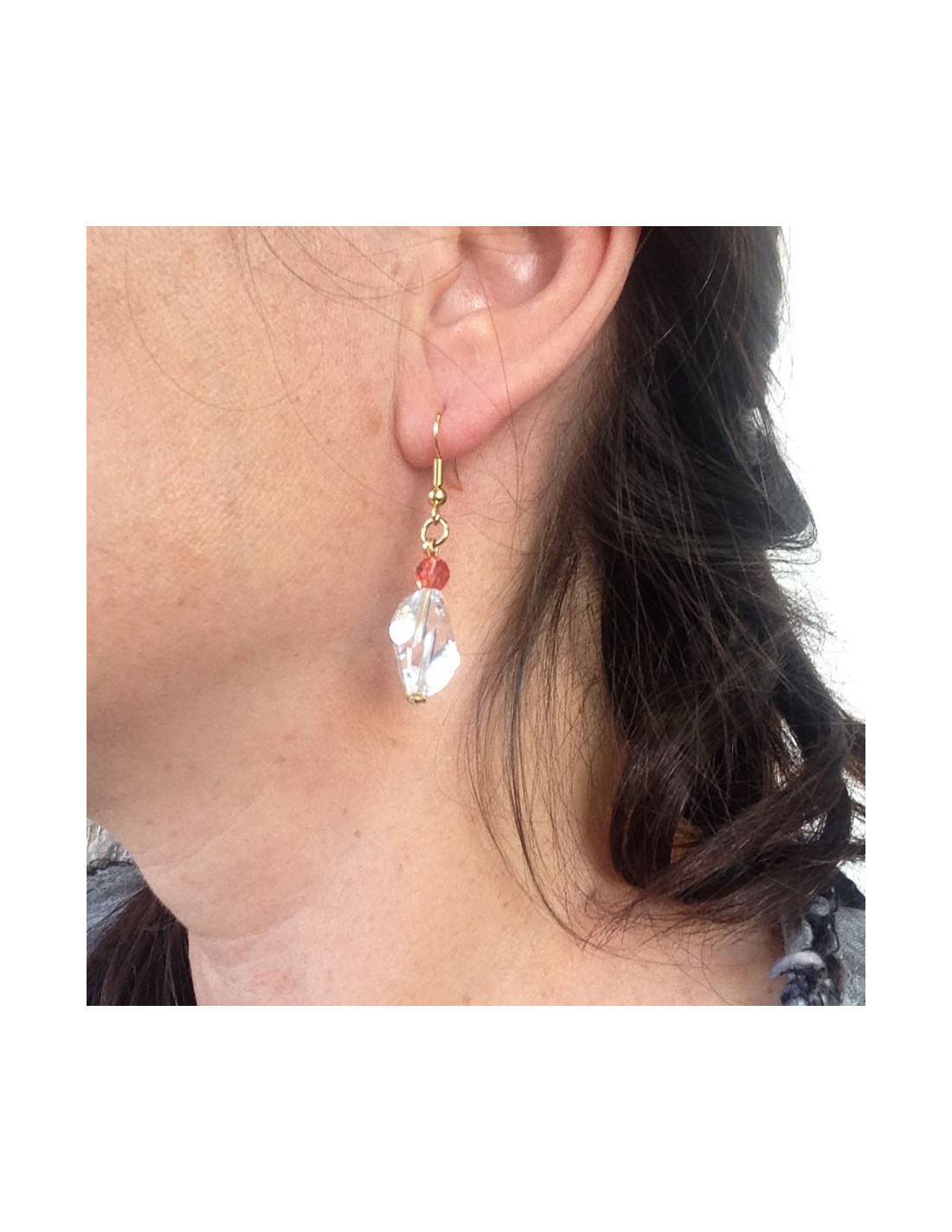 Dangling ear nails Marguerite of Valois in Swarovski crystal transparent and padparadscha (orange), metal gold fine gold, finished by a rhinestone in seam closed (Golden thin metal).