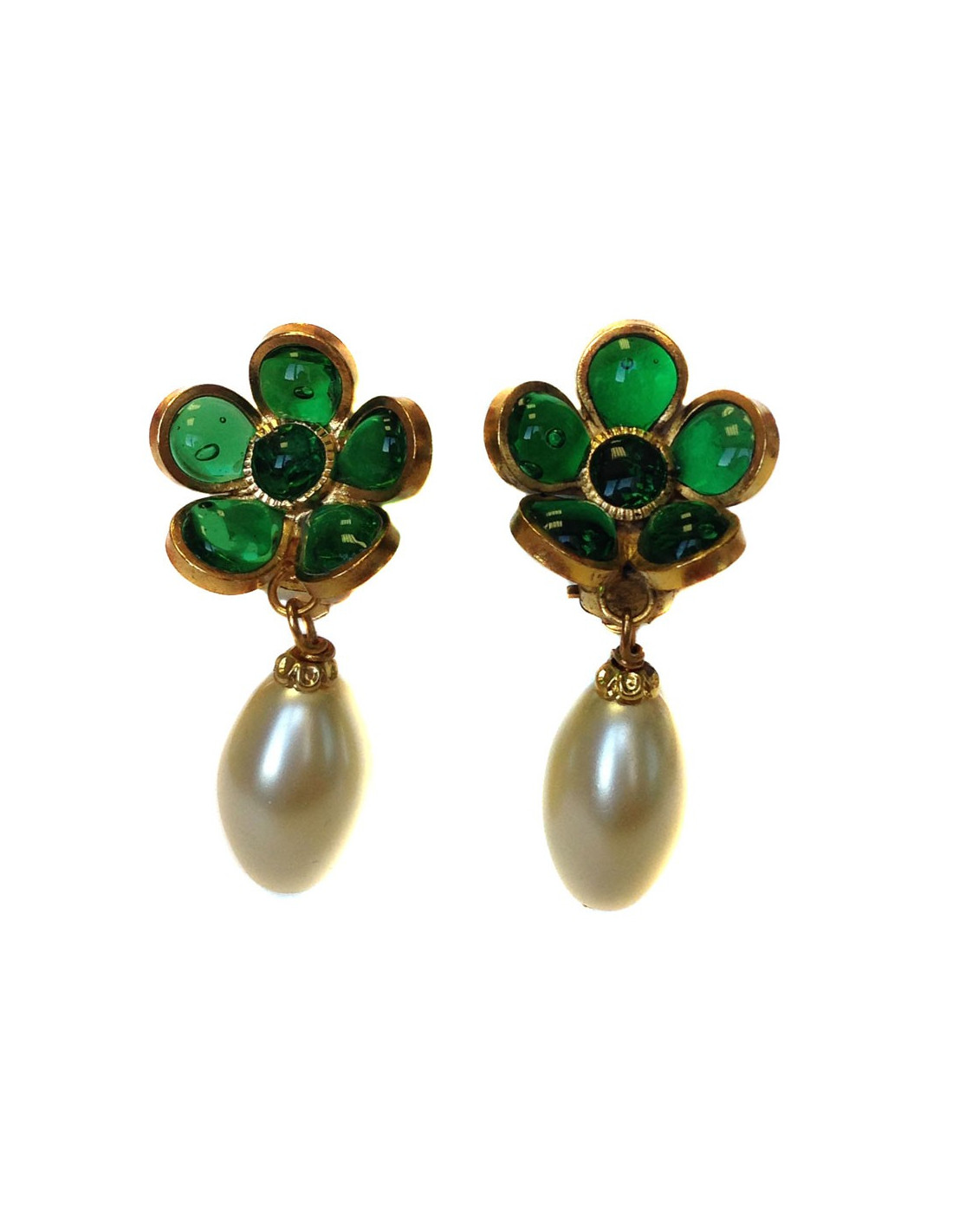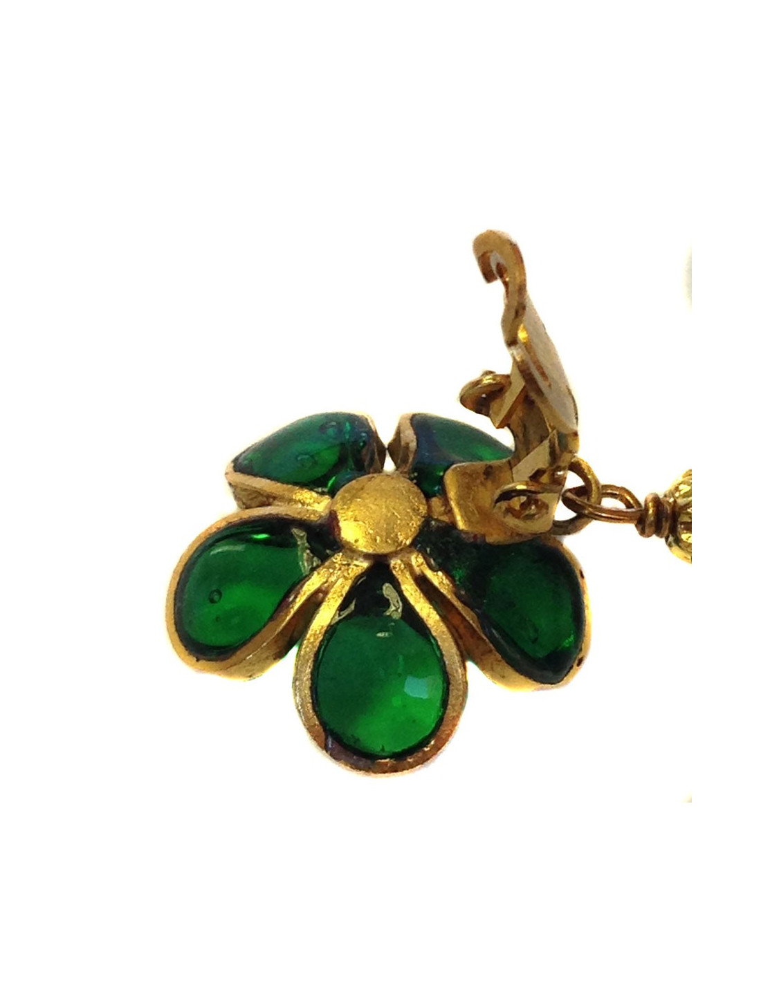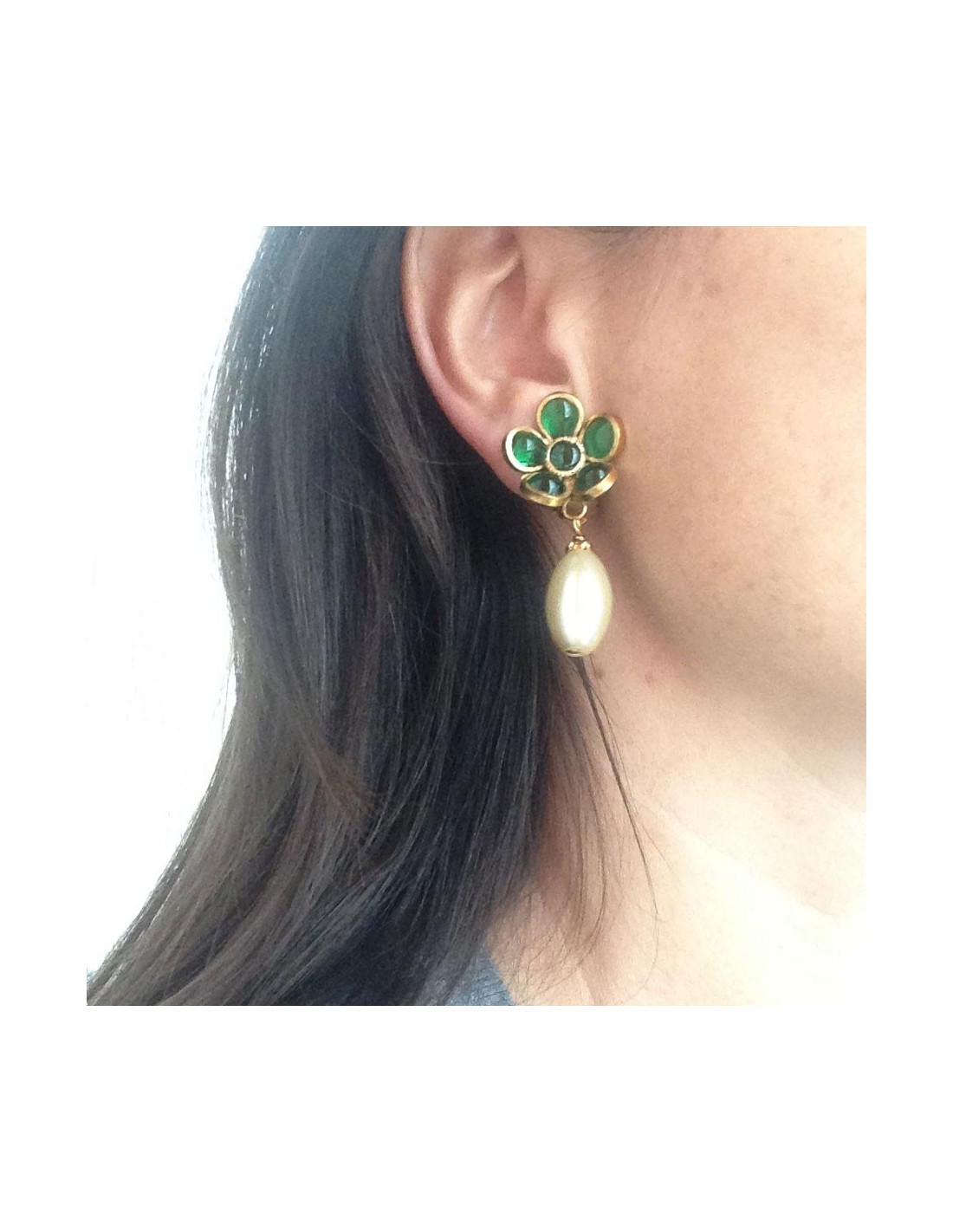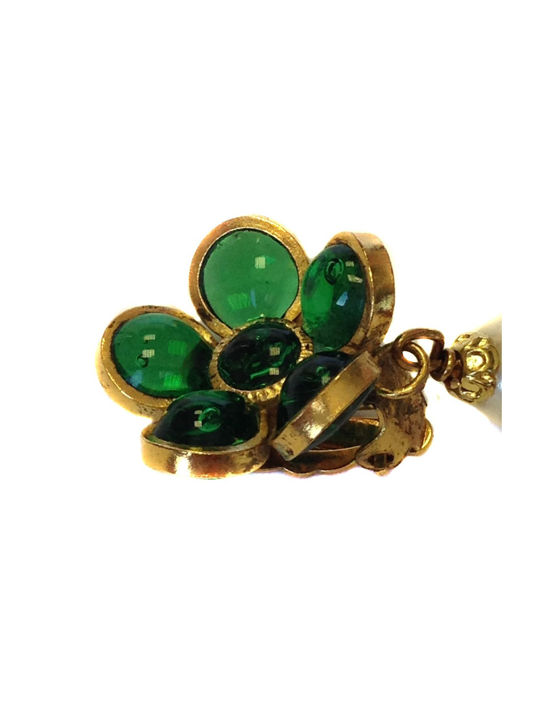 Clips of ears Marguerite of Valois flower in glass Emerald and Pearl oval bead. Metal Golden. end never worn.