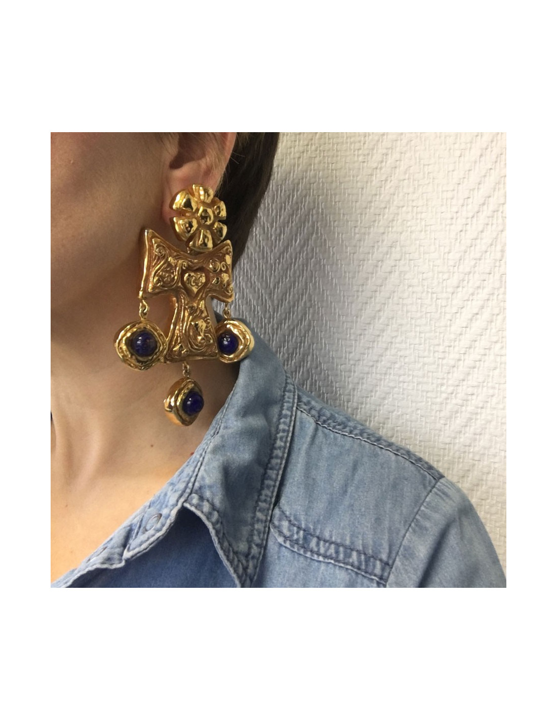 Impressive earrings clips CHRISTIAN LACROIX couture. In gold metal and gold glitter blue stone on top. In very good condition. The brand lozenge presents back.