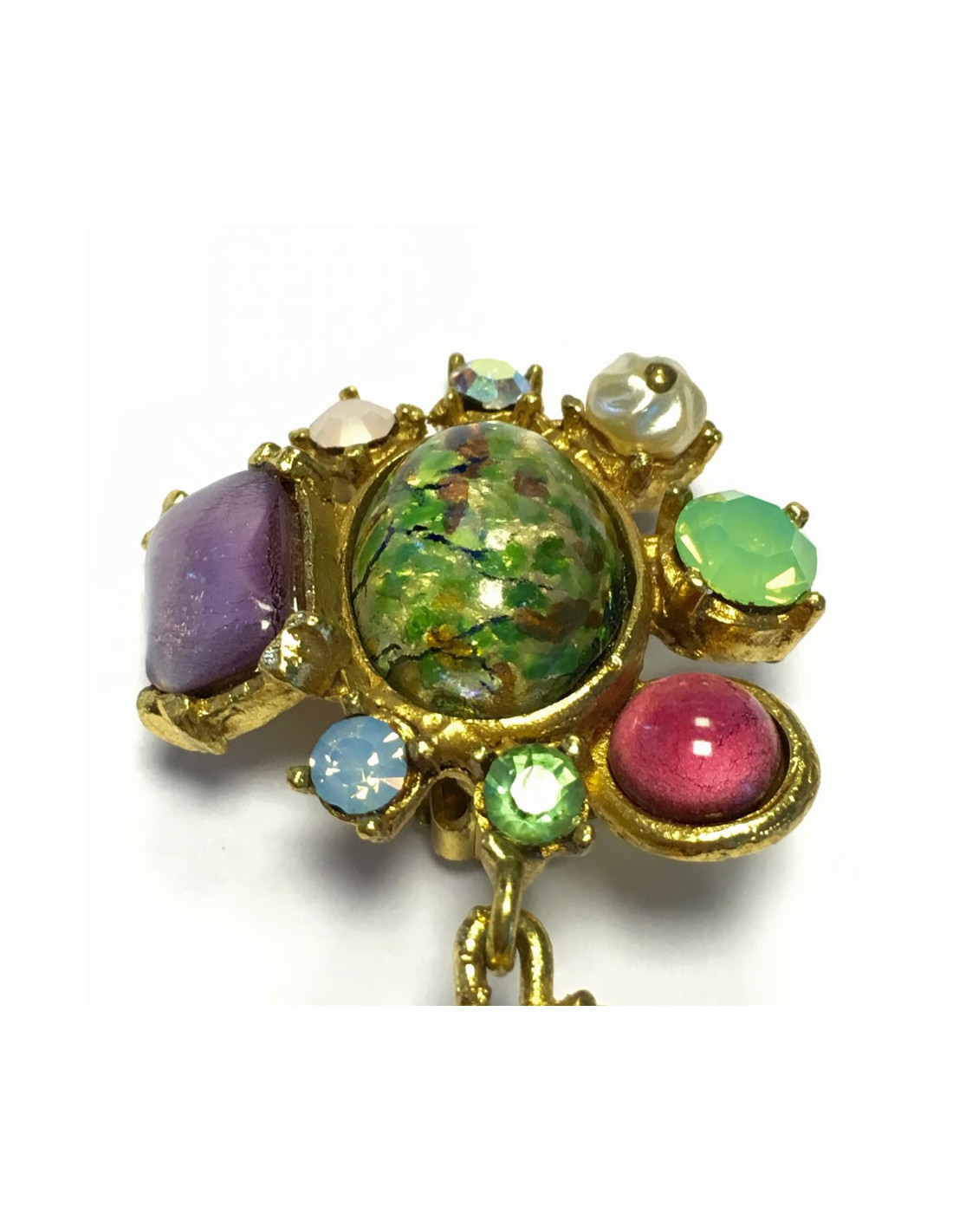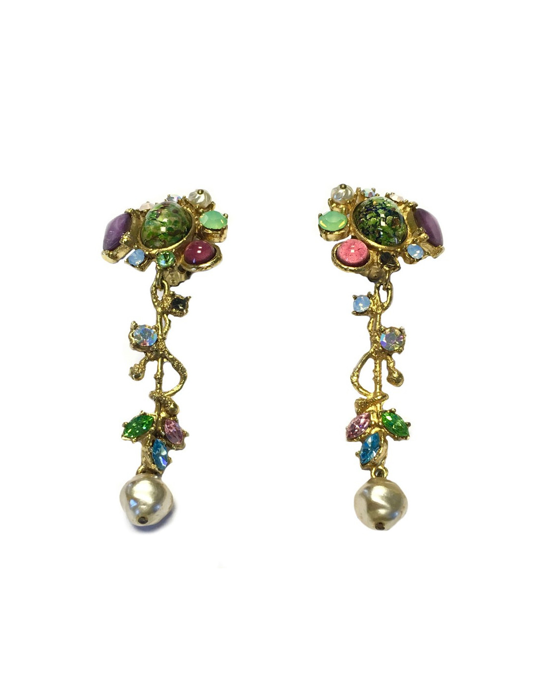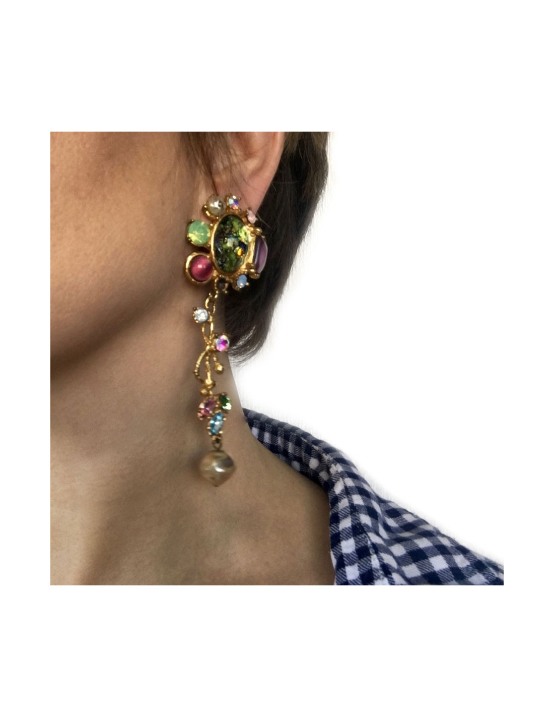Superb! Earrings hanging clips CHRISTIAN LACROIX couture. Gold metal, set with multicolored stones, pearly Pearl and rhinestones. Missing a little green rhinestones on a loop and one small blue rhinestones on the other.