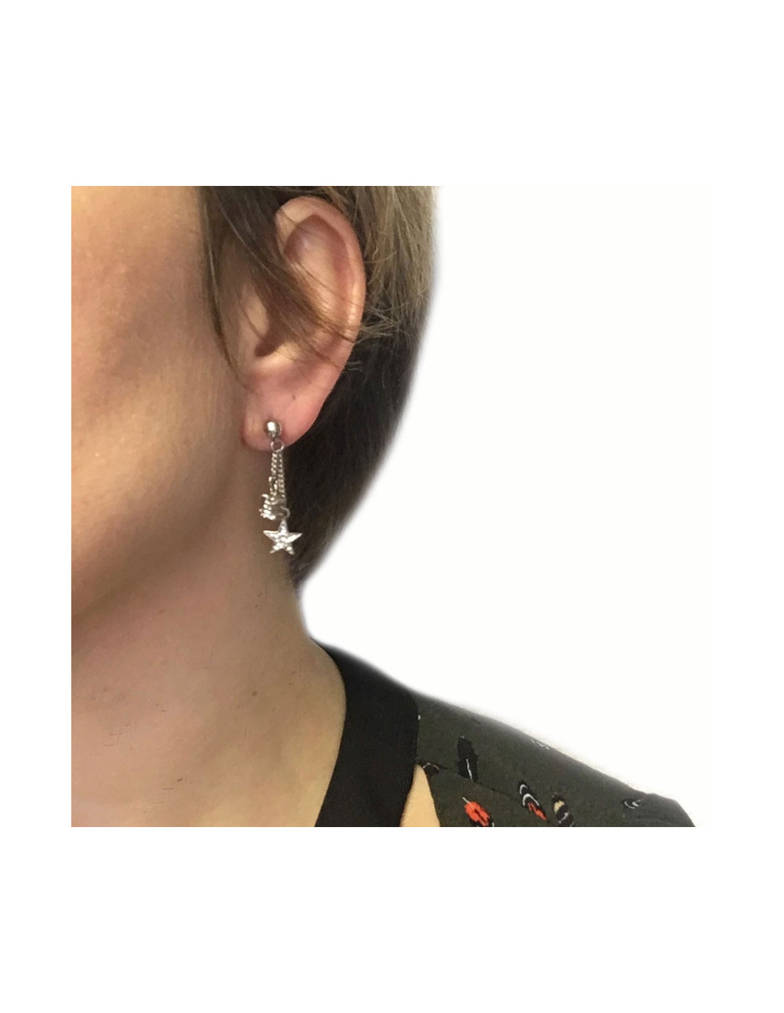 Nail pendants CHANEl silver metal and rhinestone earrings. A CC and a star embellished with Rhinestones. A small silver CC is located on the top of the loop. Never worn.