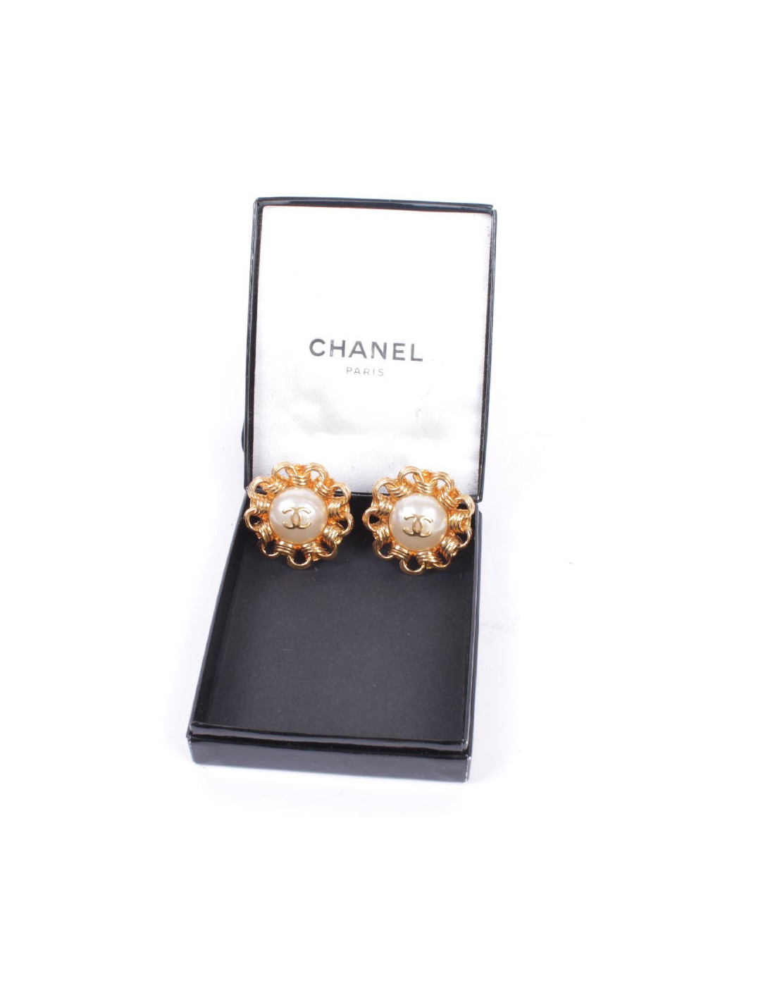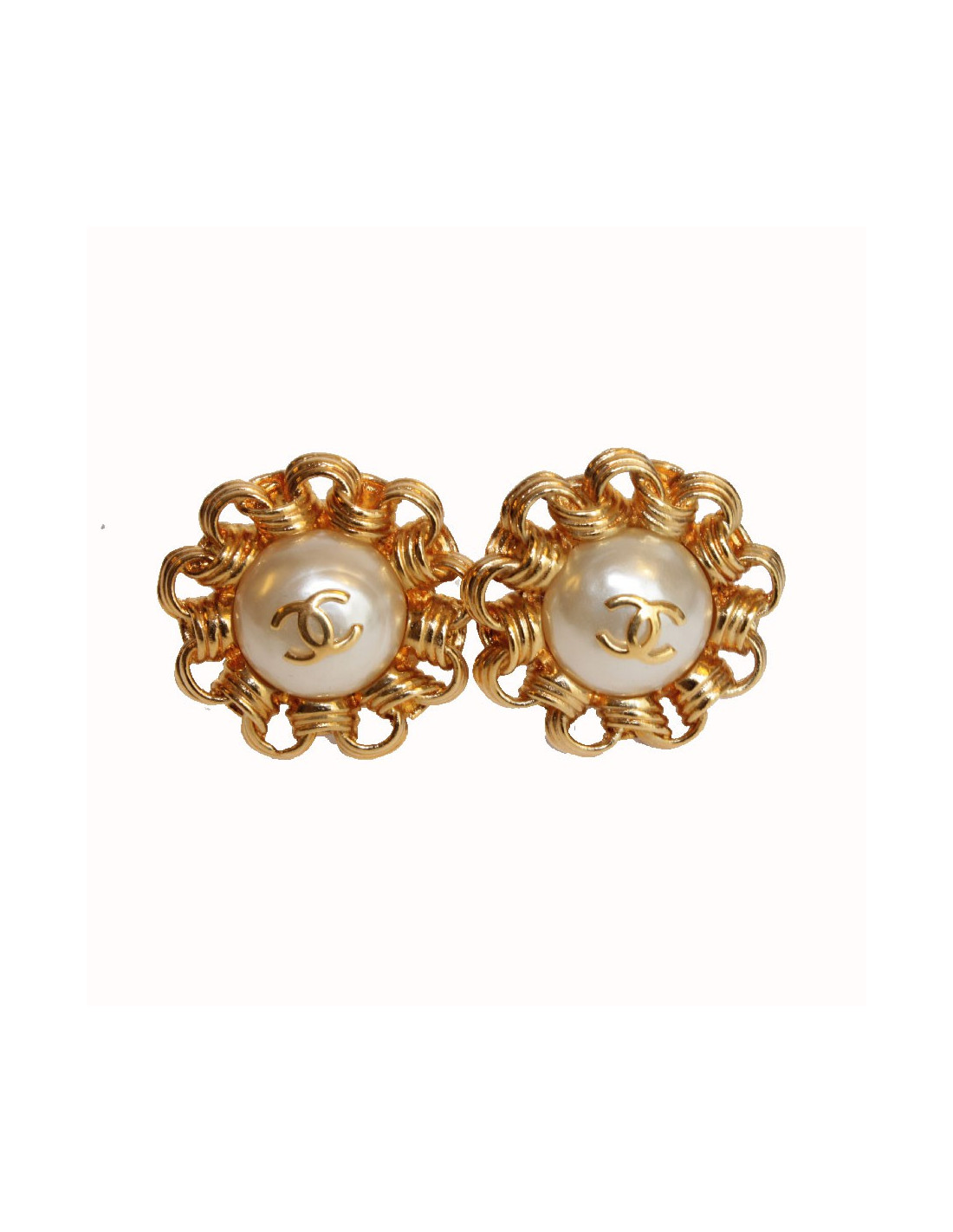 Last items in stock EARRINGS CHANEL vintage gold and pearl clip-on earrings CHANEL 29035 1,890.00 € CHANEL gilded circular clip-on earrings Condition: goodMaterials: metal, pearlColors: gold, mother-of-pearlMeasurements: 3 cm (diameter) AUTHENTICITY CERTIFIED by our expert team since 1998 Add to cart