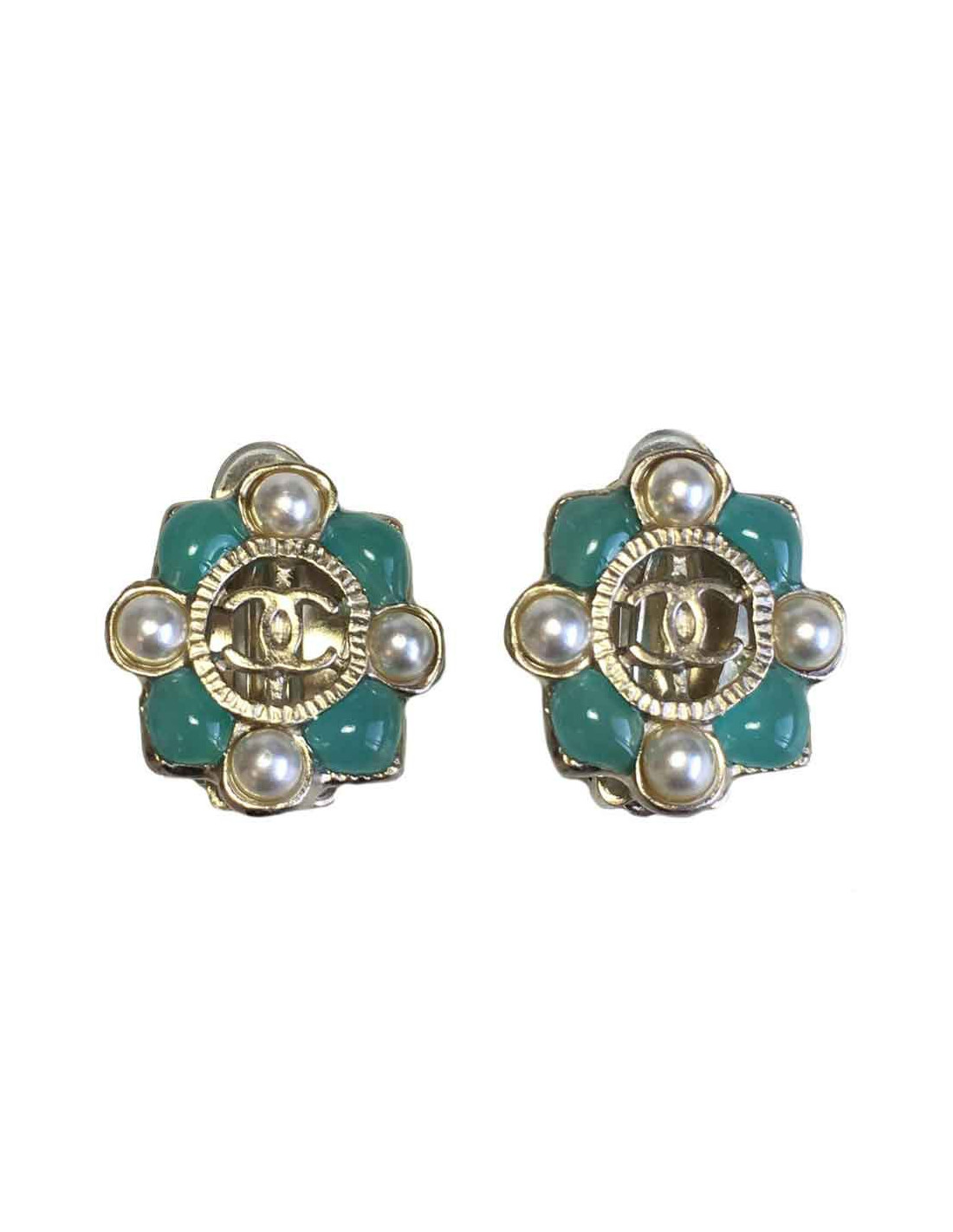 CHANEL Clip-on Earrings in Gilded Metal, Green Resin and Pearls
