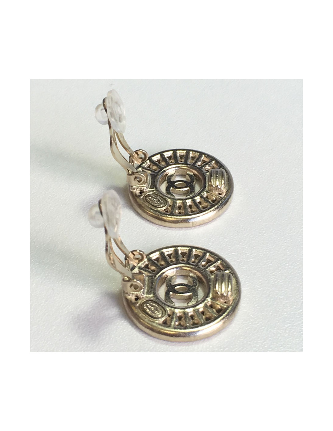 CHANEL round clip-on earrings in gilded metal, CC and Rhinestones