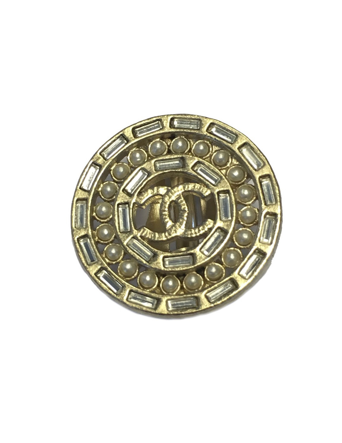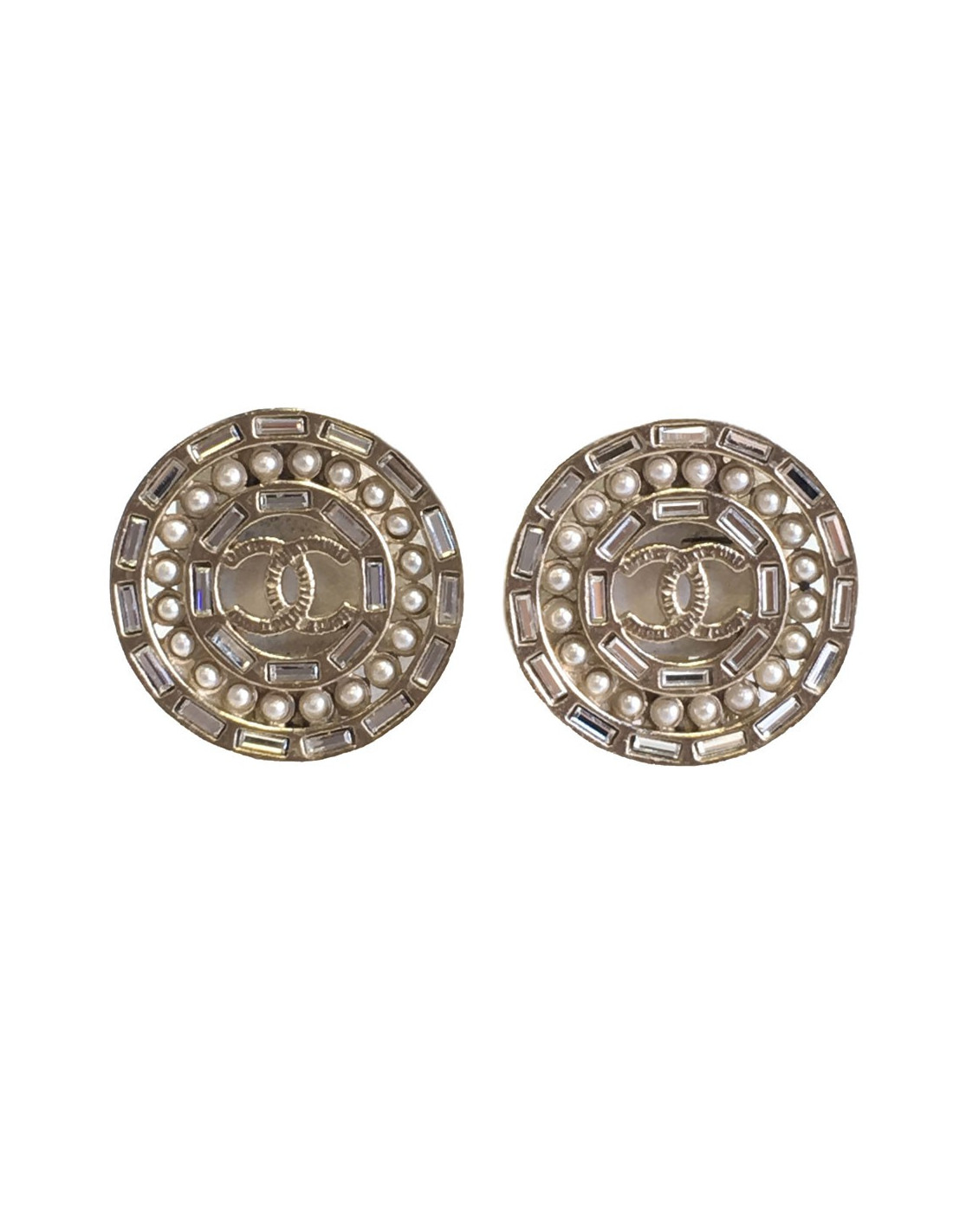 Elegant pair of Chanel round clip-on earrings in matte gold metal, set with emerald-cut rhinestones, pearls and a hammered CC in the center.