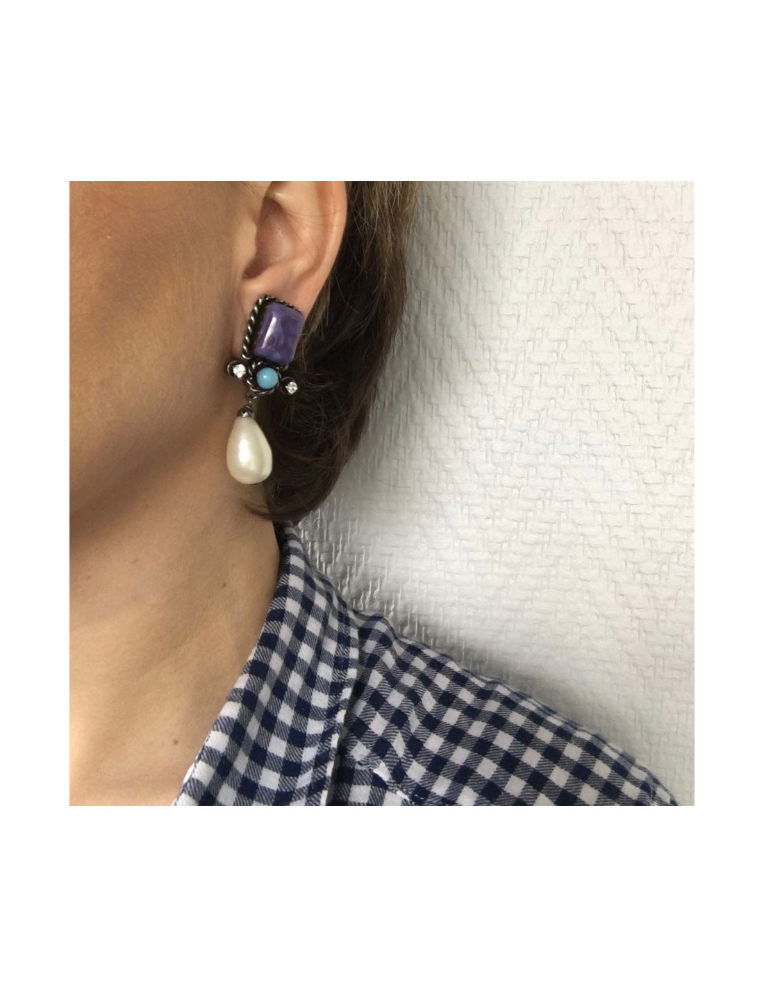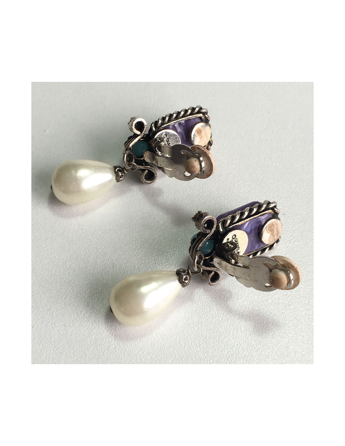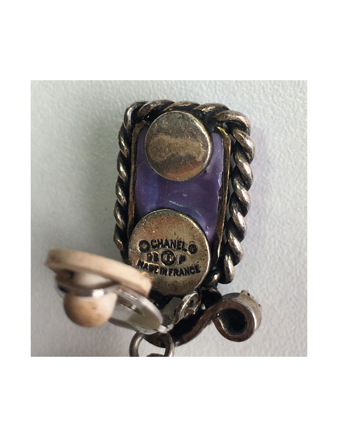Sewing! Earrings clips CHANEL metal ruthenium, rhinestone, glass, turquoise, purple and oval glass bead. In very good condition.
