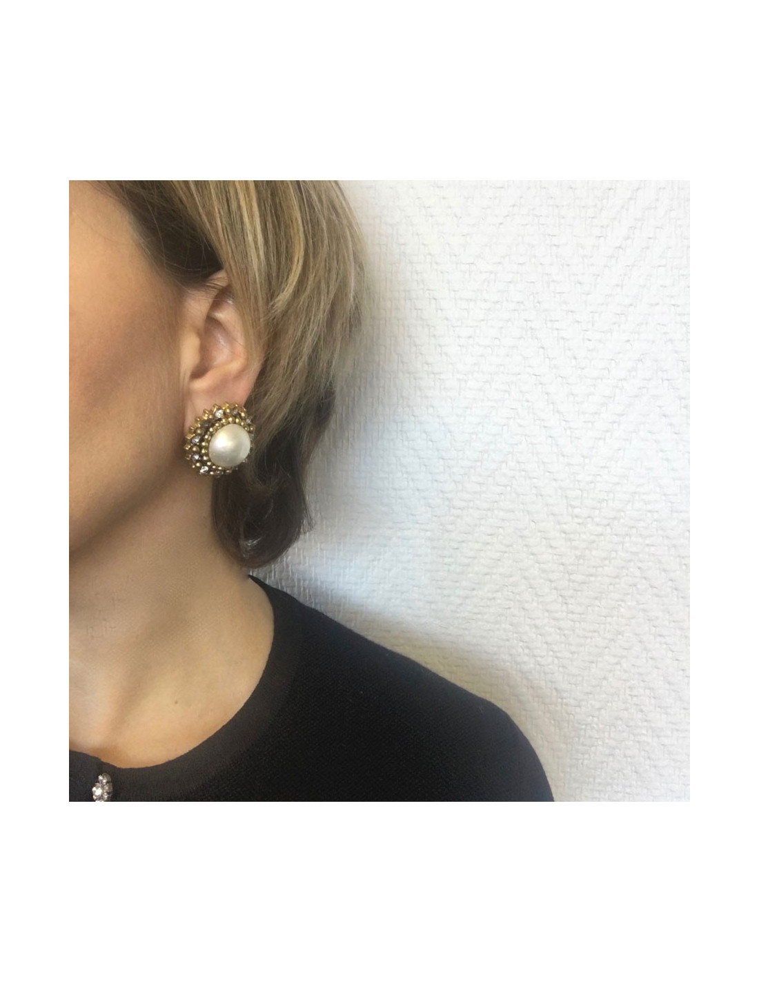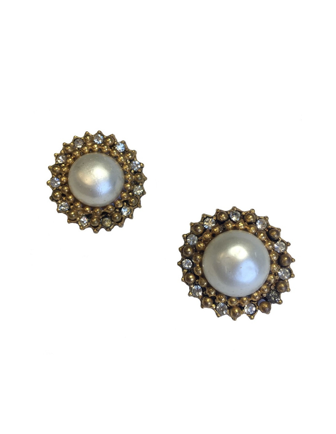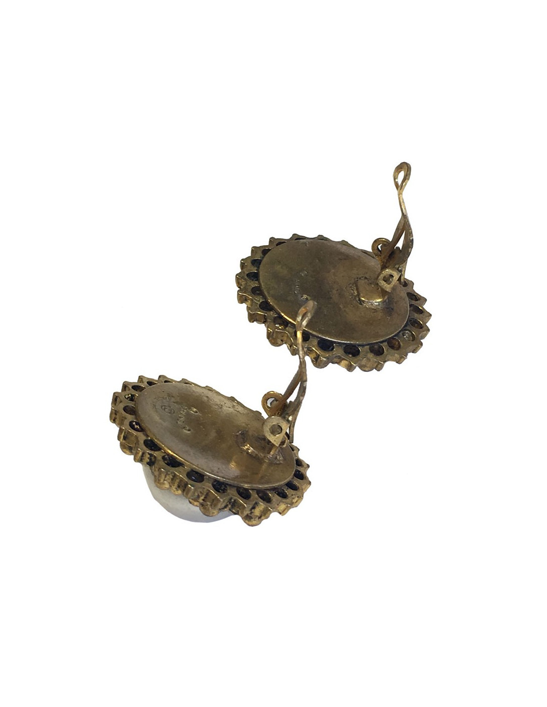Couture! CHANEL clip-on earrings in aged gold metal, pearl in molten glass surrounded by a row of rhinestones.