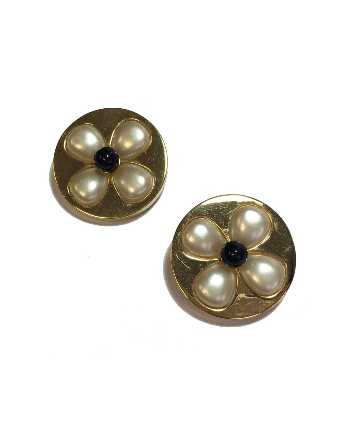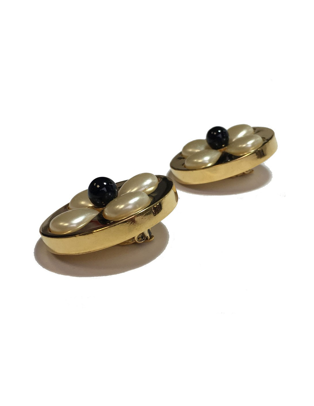 Couture! vintage CHANEL clip-on earrings in gilded metal, pearls in the shape of pearly petals and black pearl in the center. Letter S engraved. It comes from press sales. Dimensions: diameter of clip-on earring : 4,5 cm Will be delivered in a Valois Vintage Paris Dustbag
