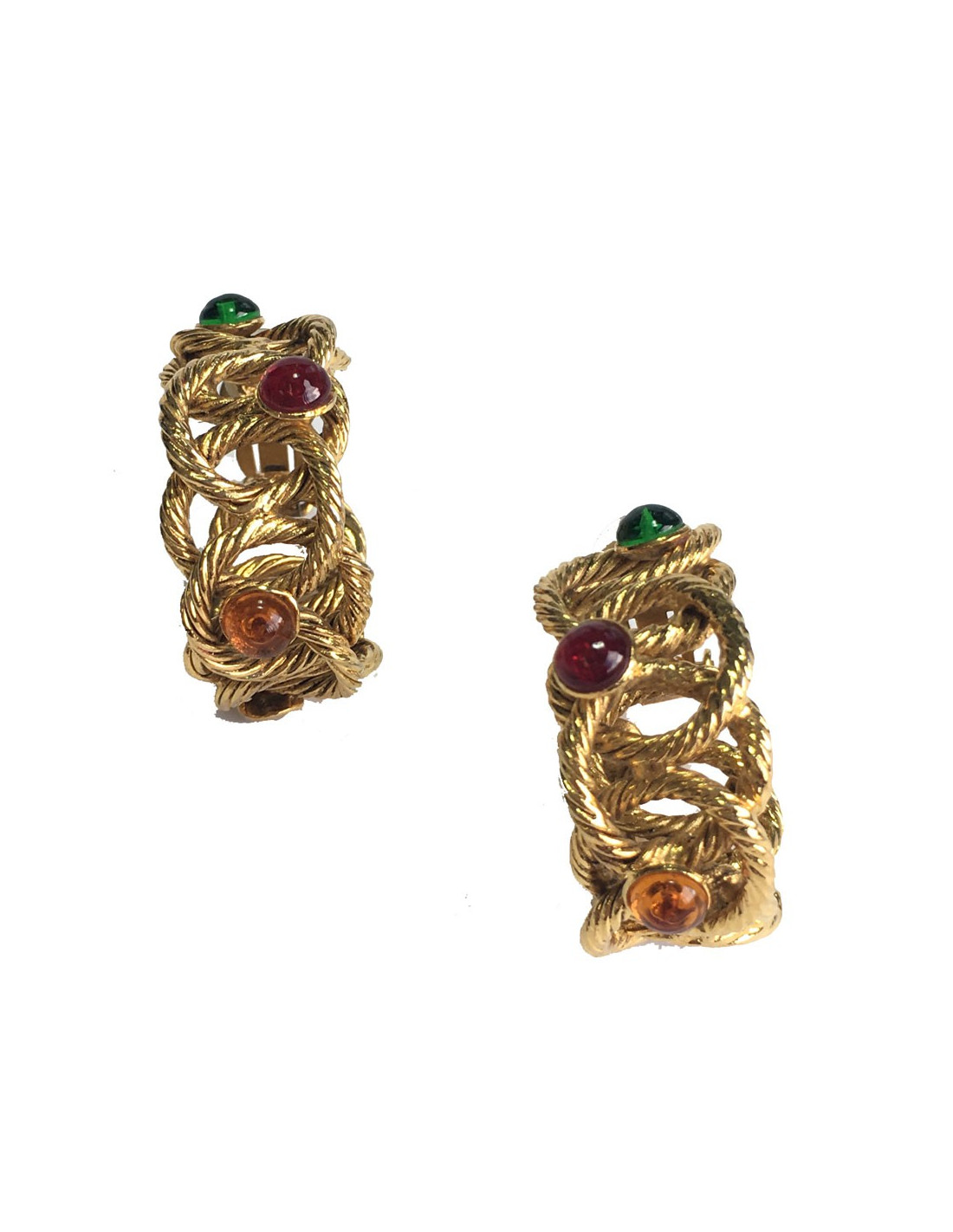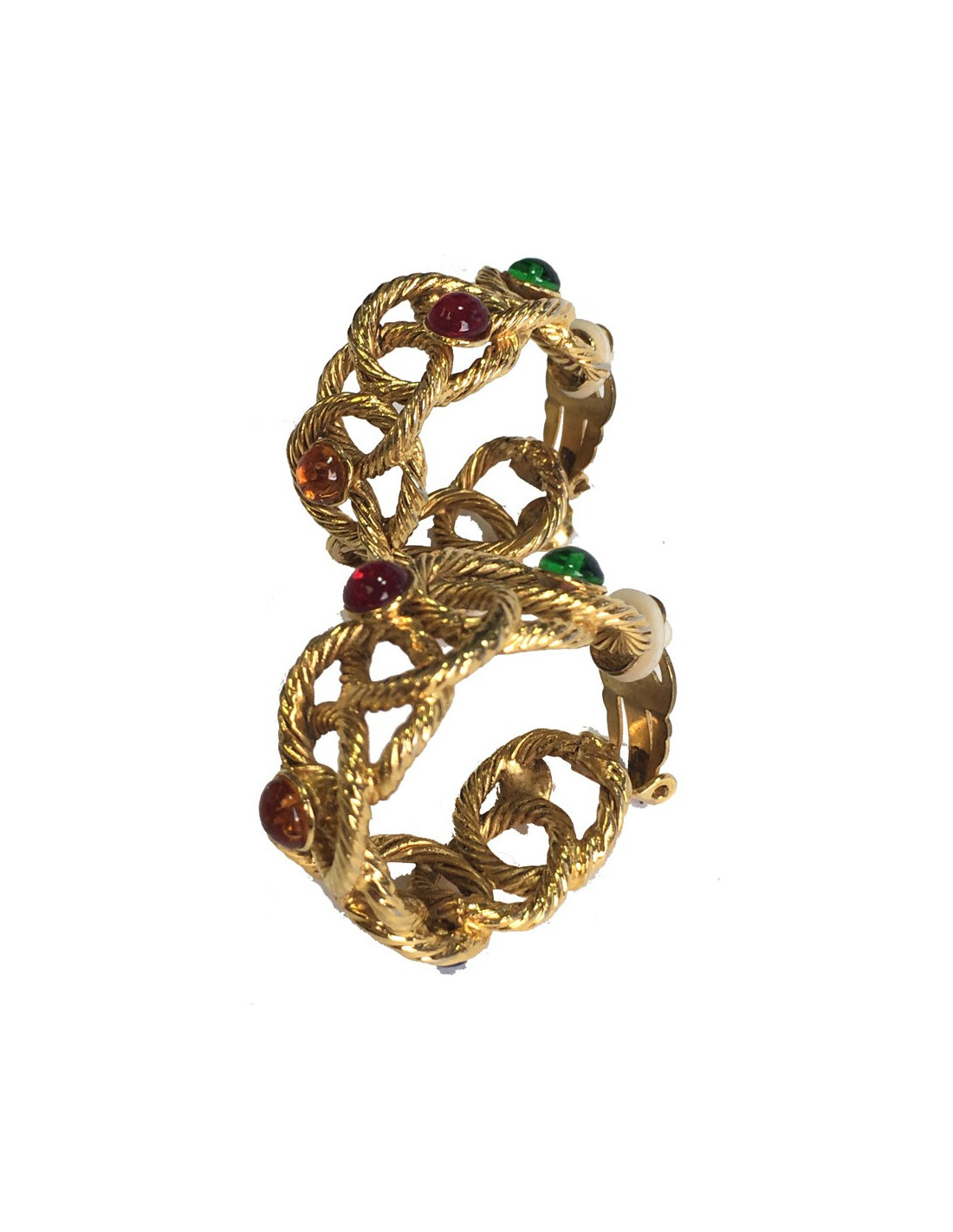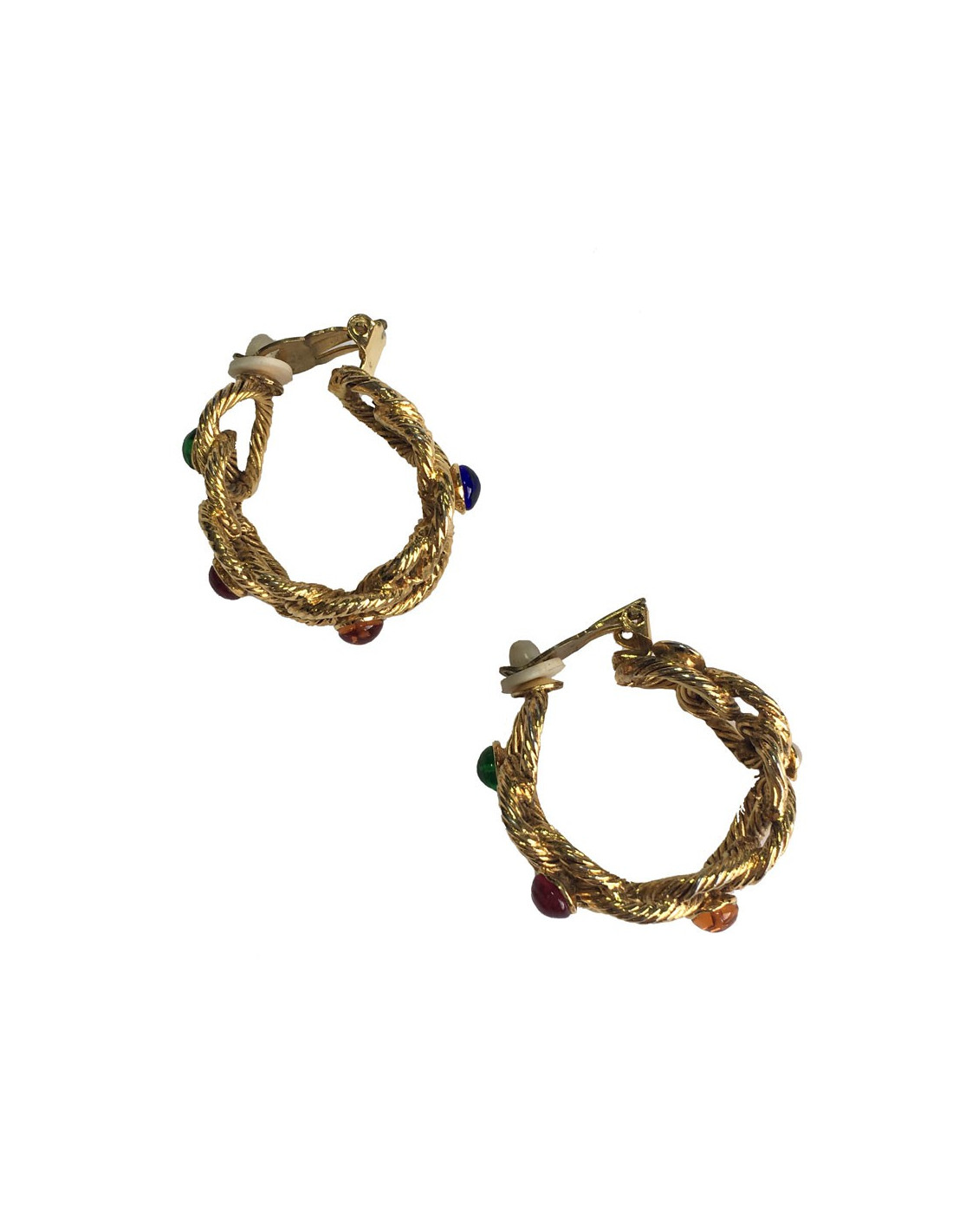 Creole earrings in gold colored and twisted metal and multicolored pearls