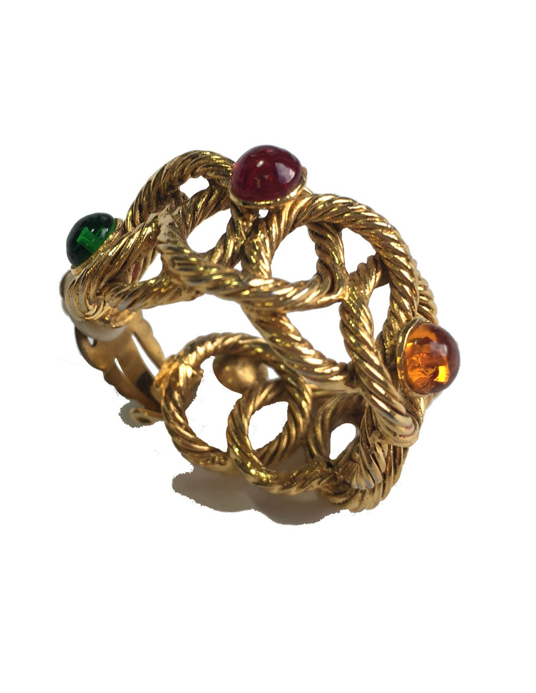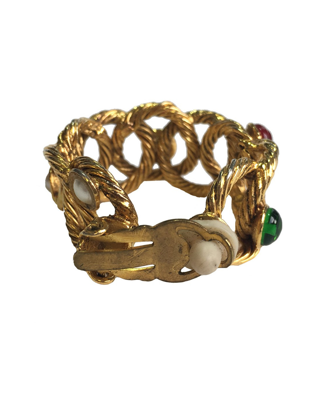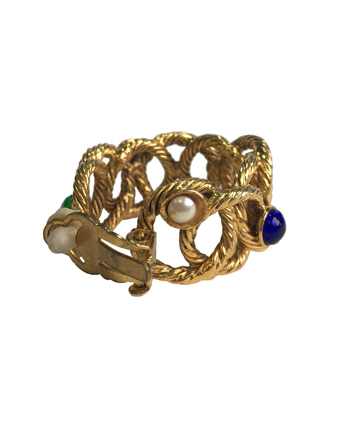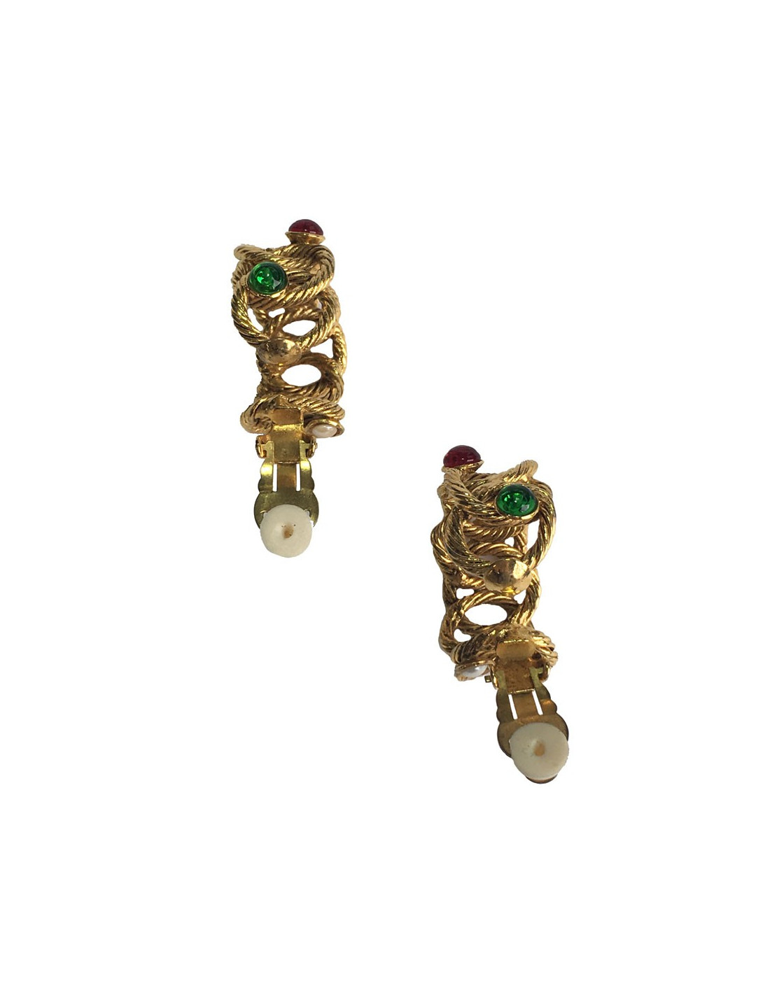 Creole earrings in gold colored and twisted metal and multicolored pearls