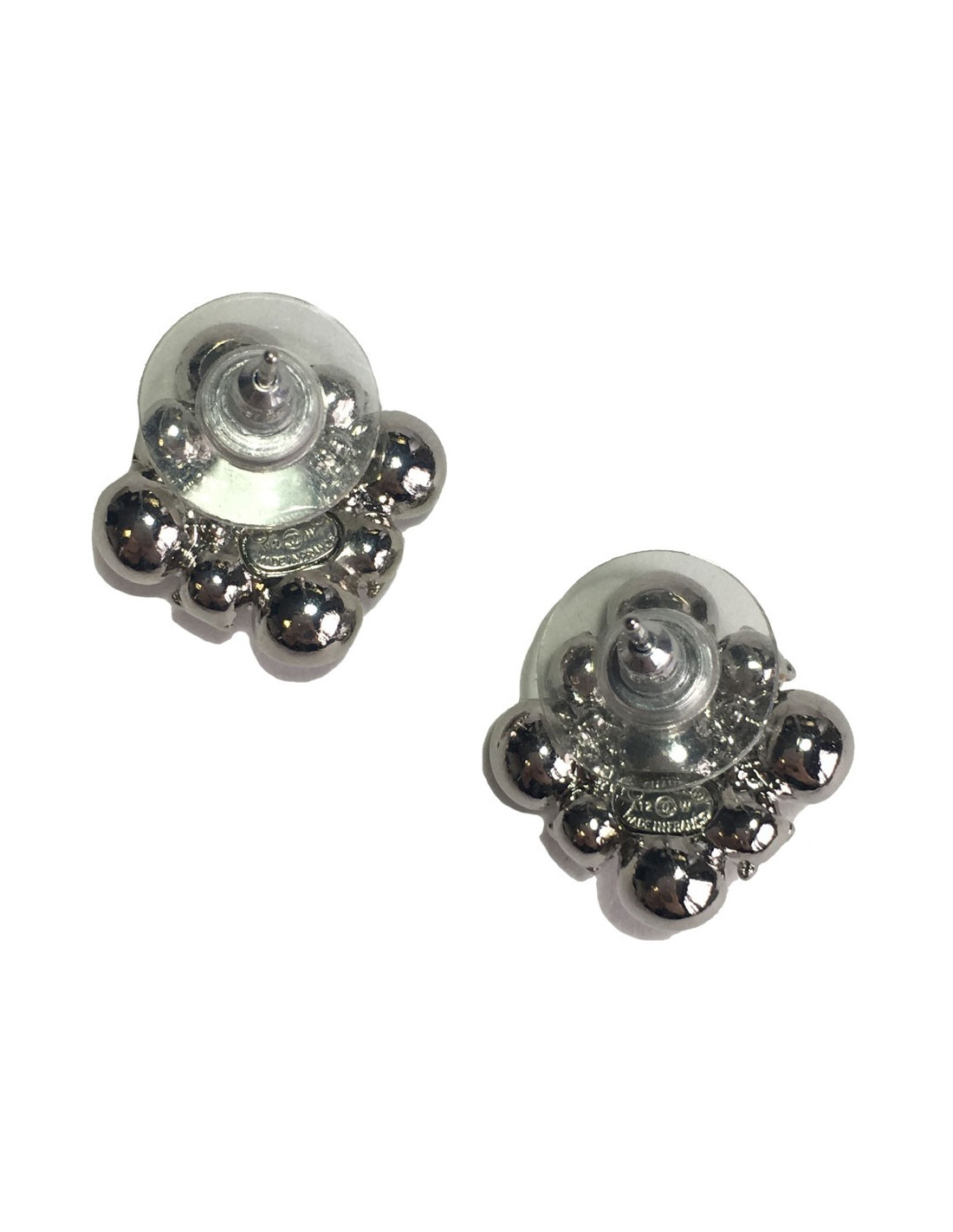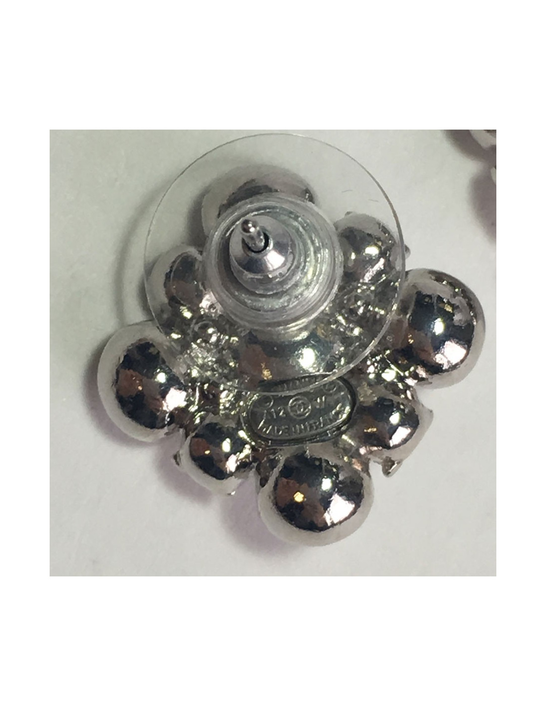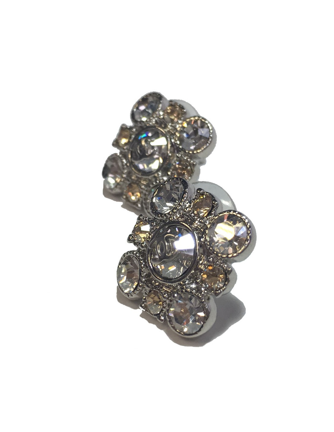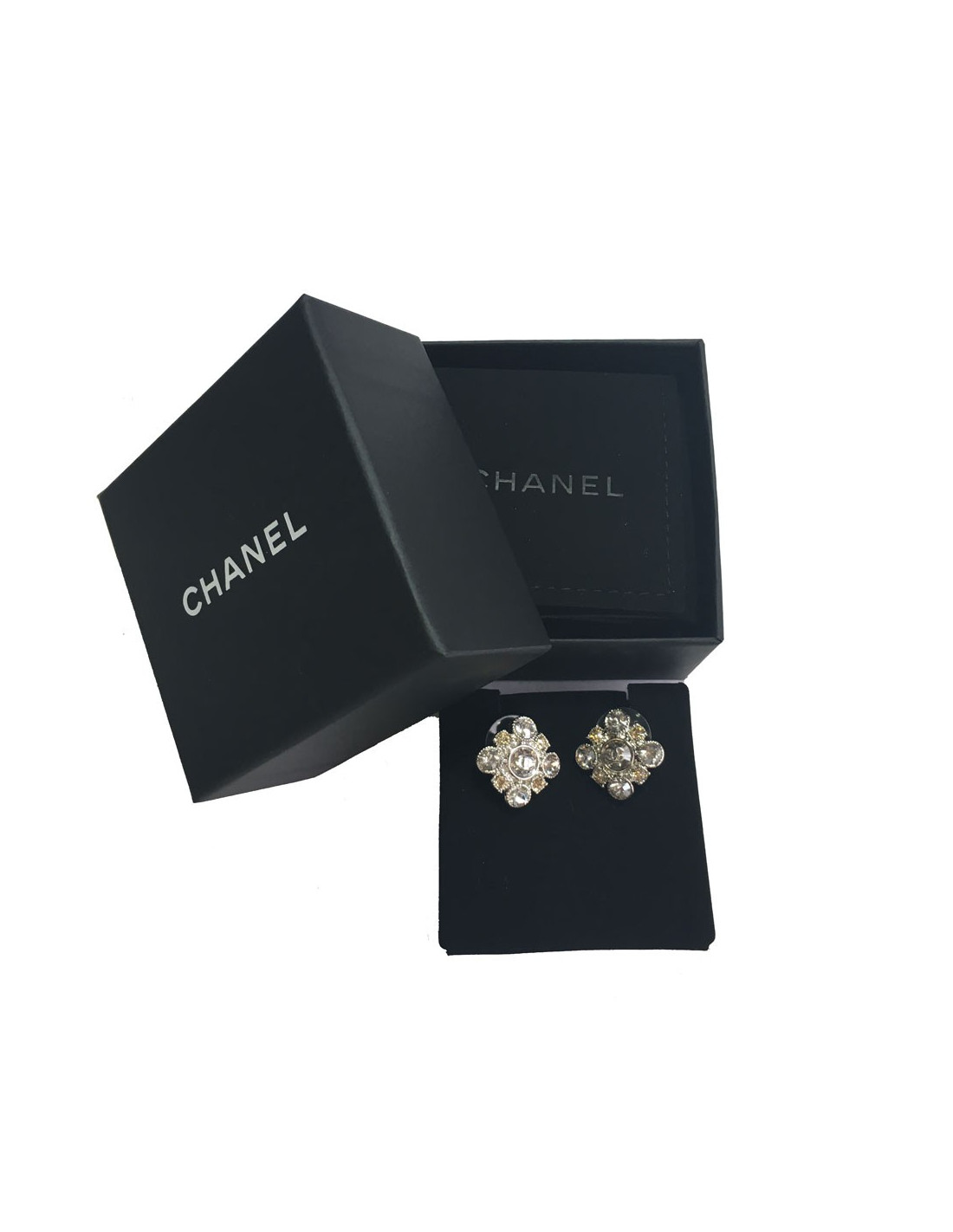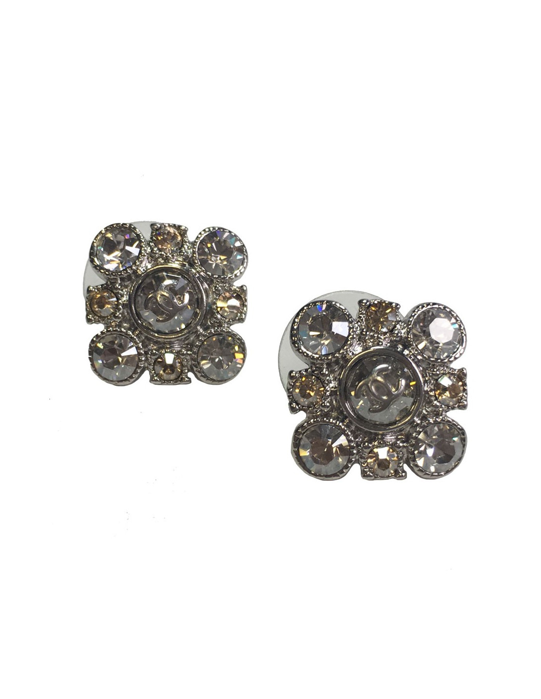 Beautiful square Chanel studs earrings set with yellow and white rhinestones. A small silvery metal cc is on the central brilliant.
