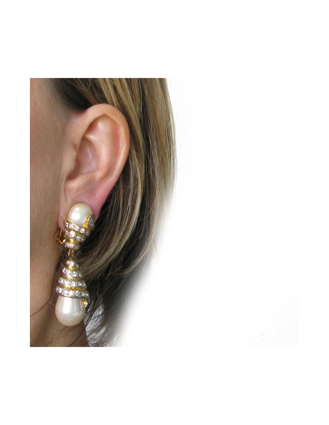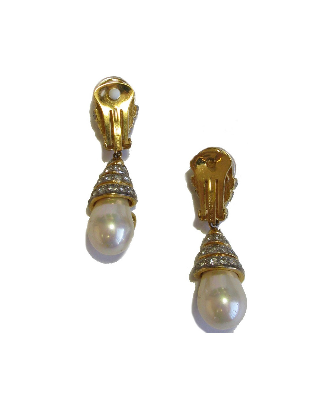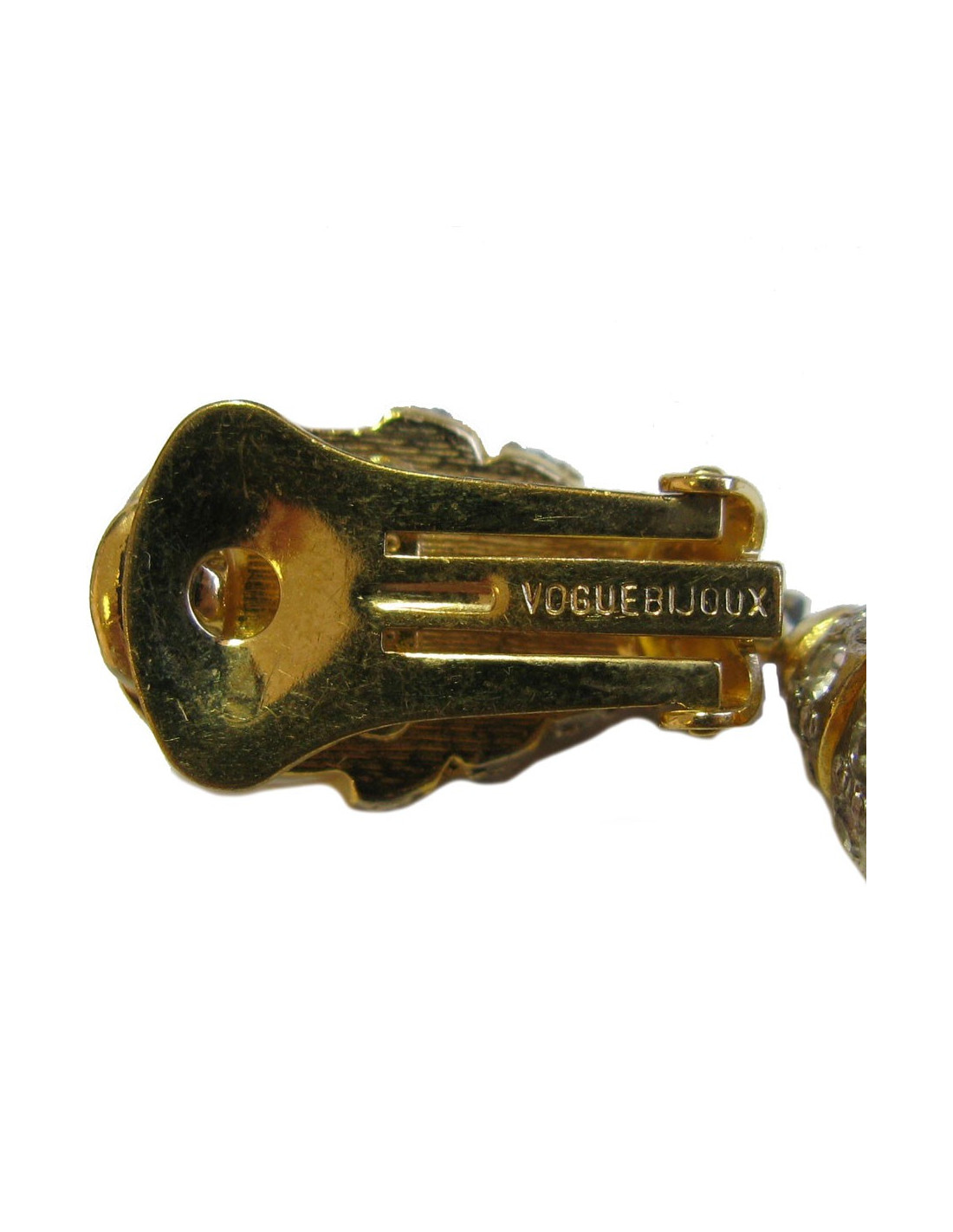 Boucles d'oreille clips pendants Vogue Bijoux en métal doré, serties de strass et perles nacrées.