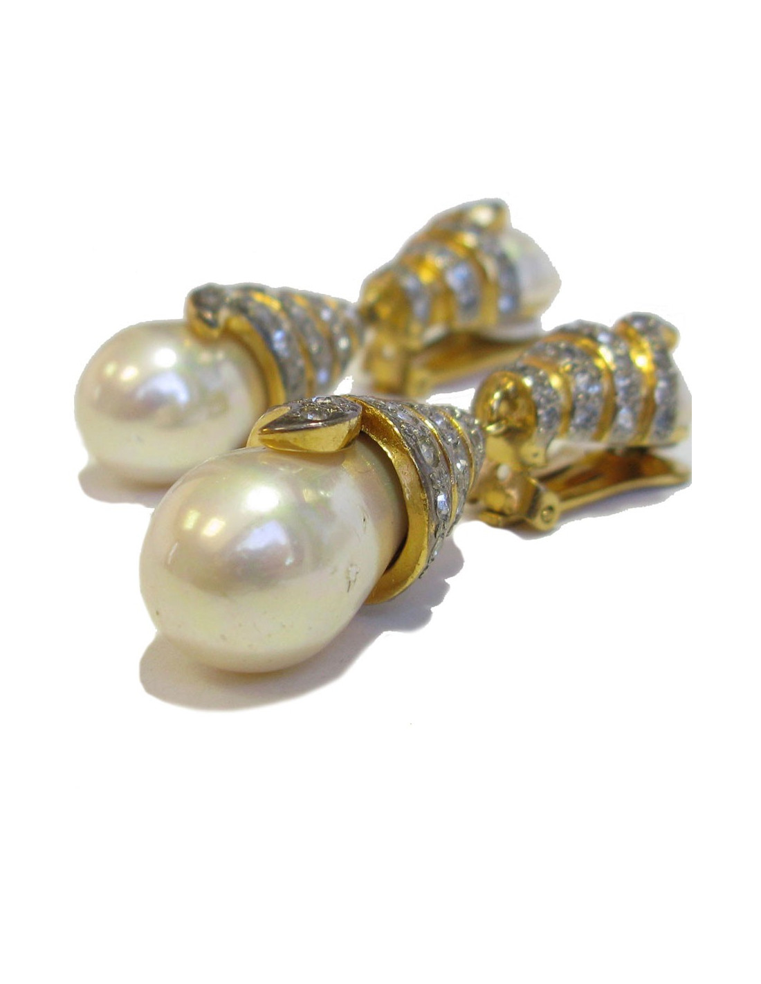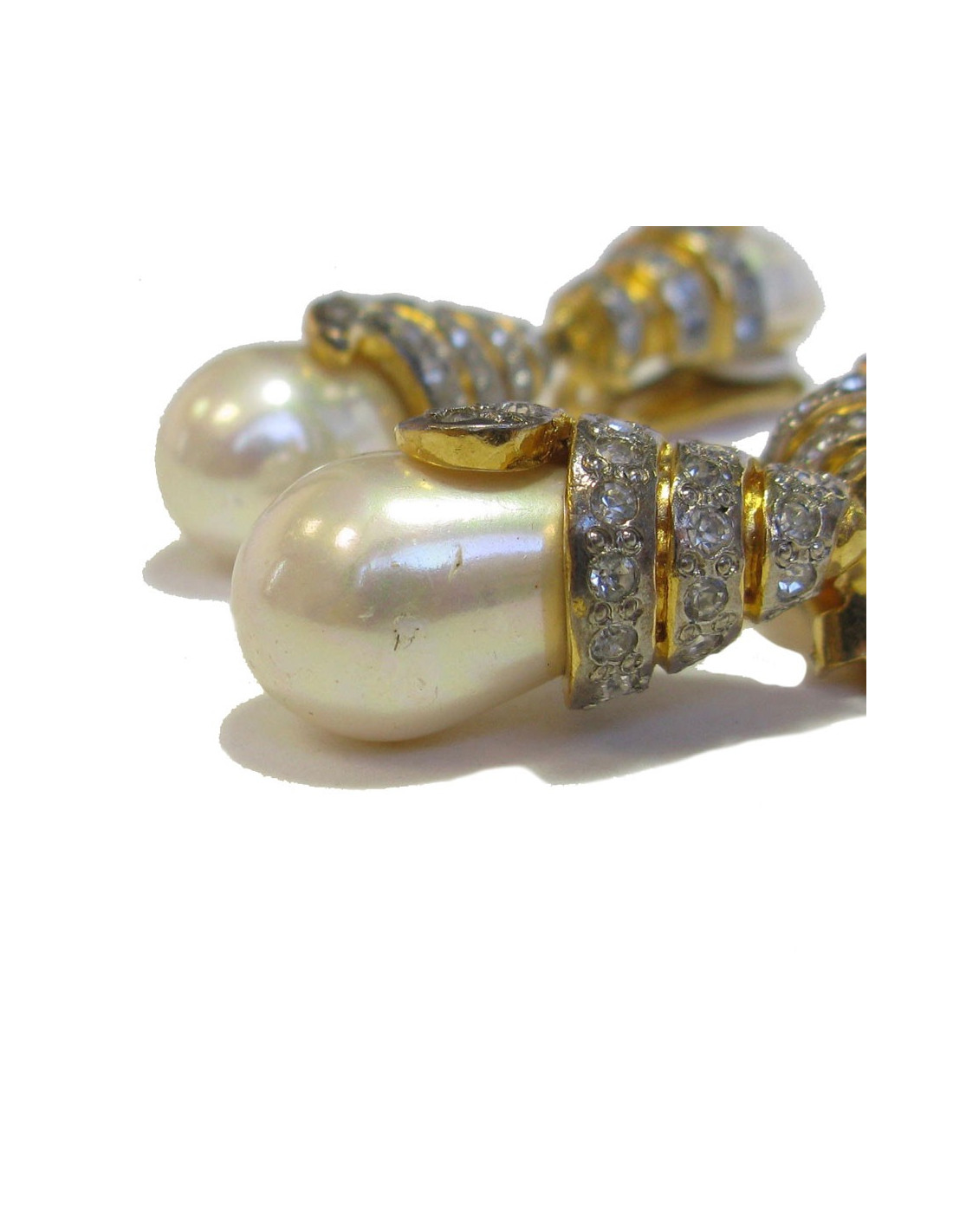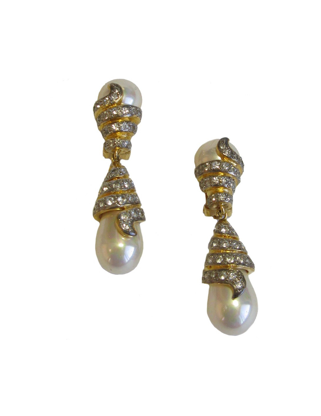 Boucles d'oreille clips pendants Vogue Bijoux en métal doré, serties de strass et perles nacrées.