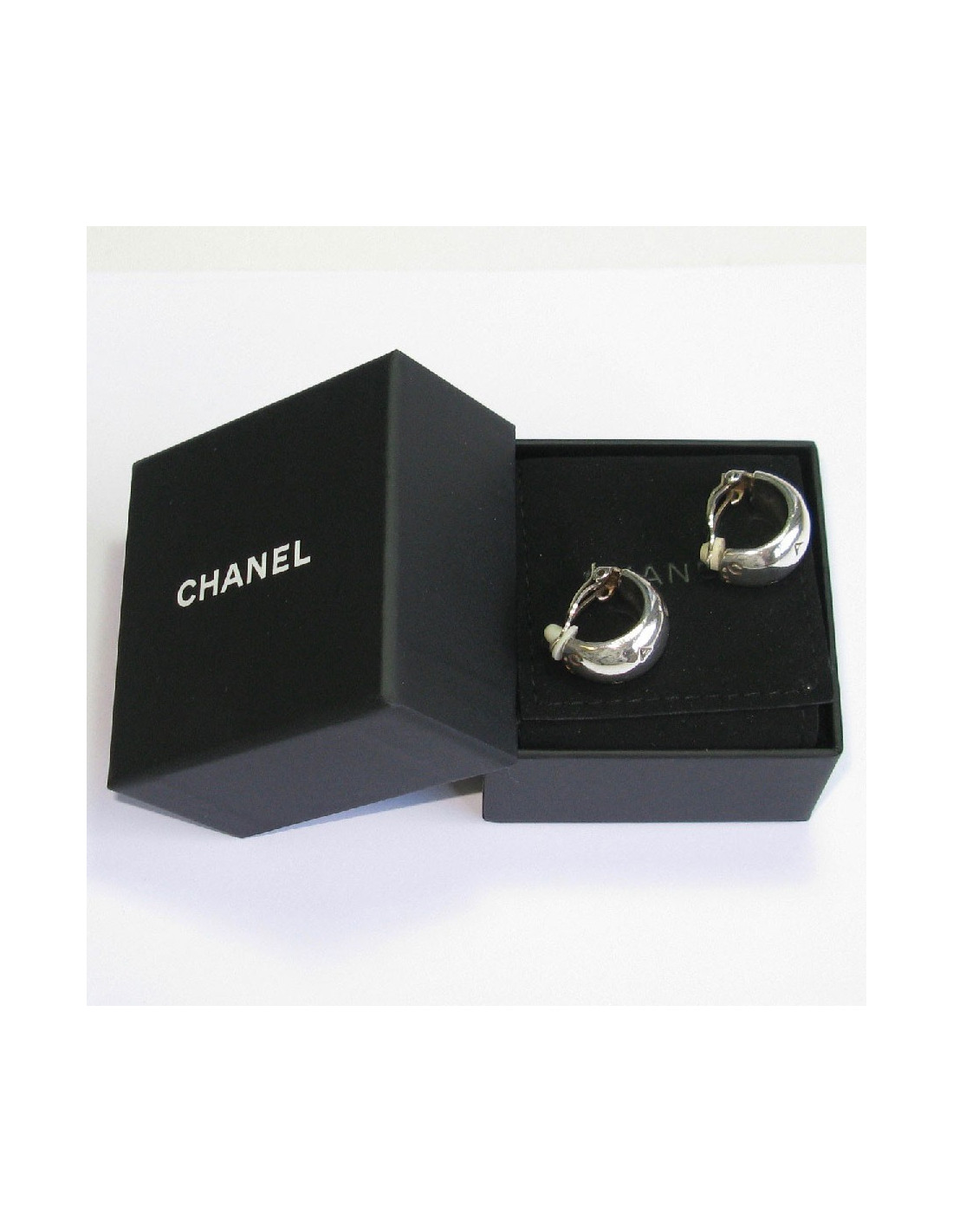 Chanel clip-on earring in 925Ag sterling silver. The CHANEL brand is engraved on each clip.