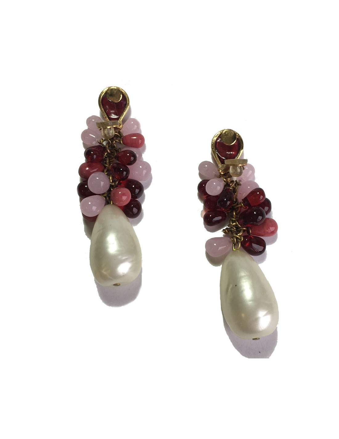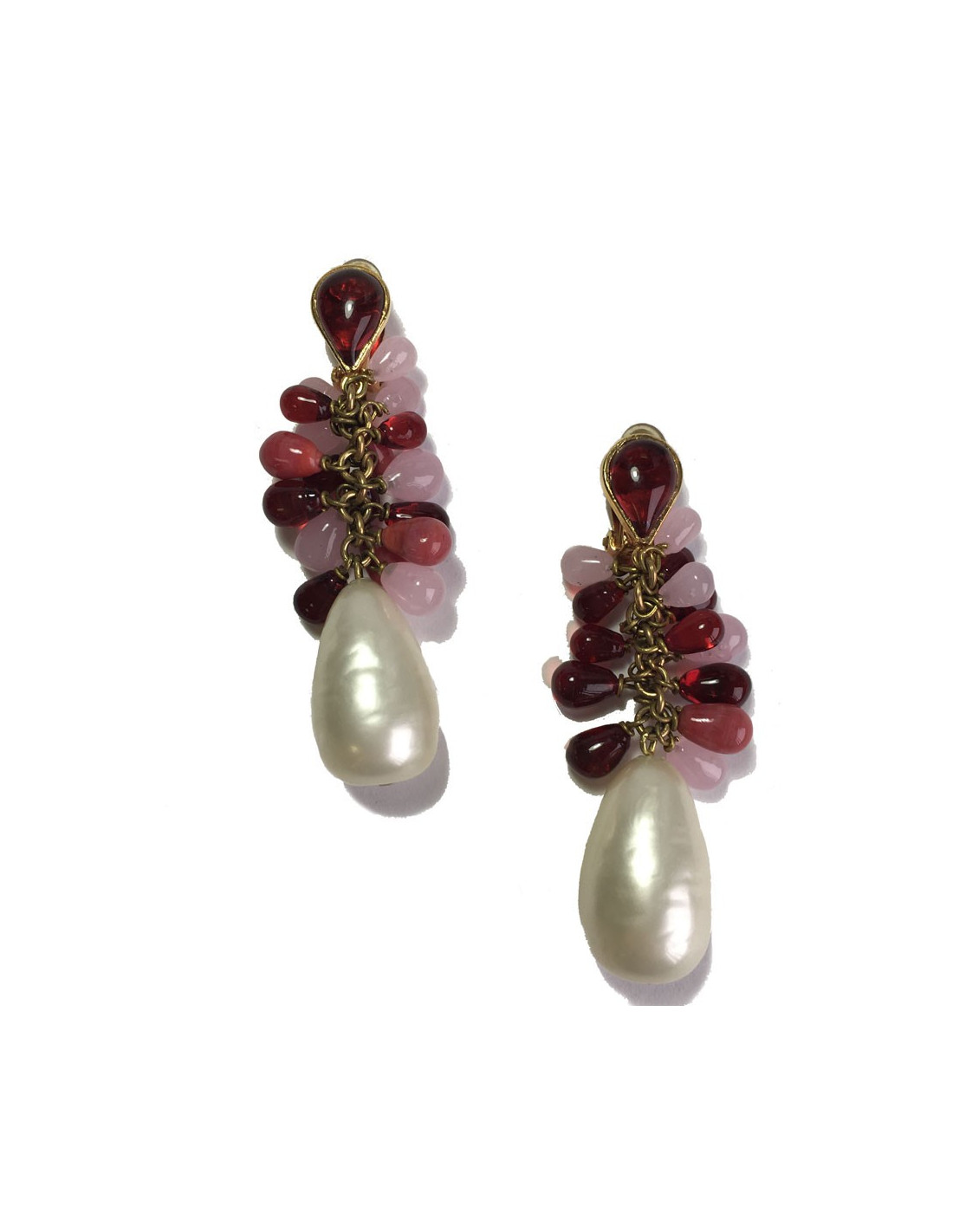 Couture! Marguerite de Valois clip-on earrings in gold-plated metal, tassels in pink and red molten glass and a beautiful pearl, drop shape, in pearly molten glass.