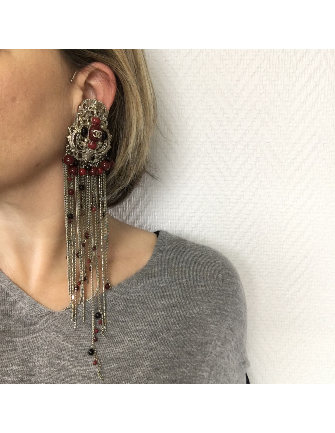 Splendid and Couture !! Chanel clip-on earring from the Paris Bombay 2011/2012 Métiers d'Art Collection. Made with gilt metal, pendant chains, burgundy and red molten glass. An open ring allows to hook the loop on the top of the ear.
