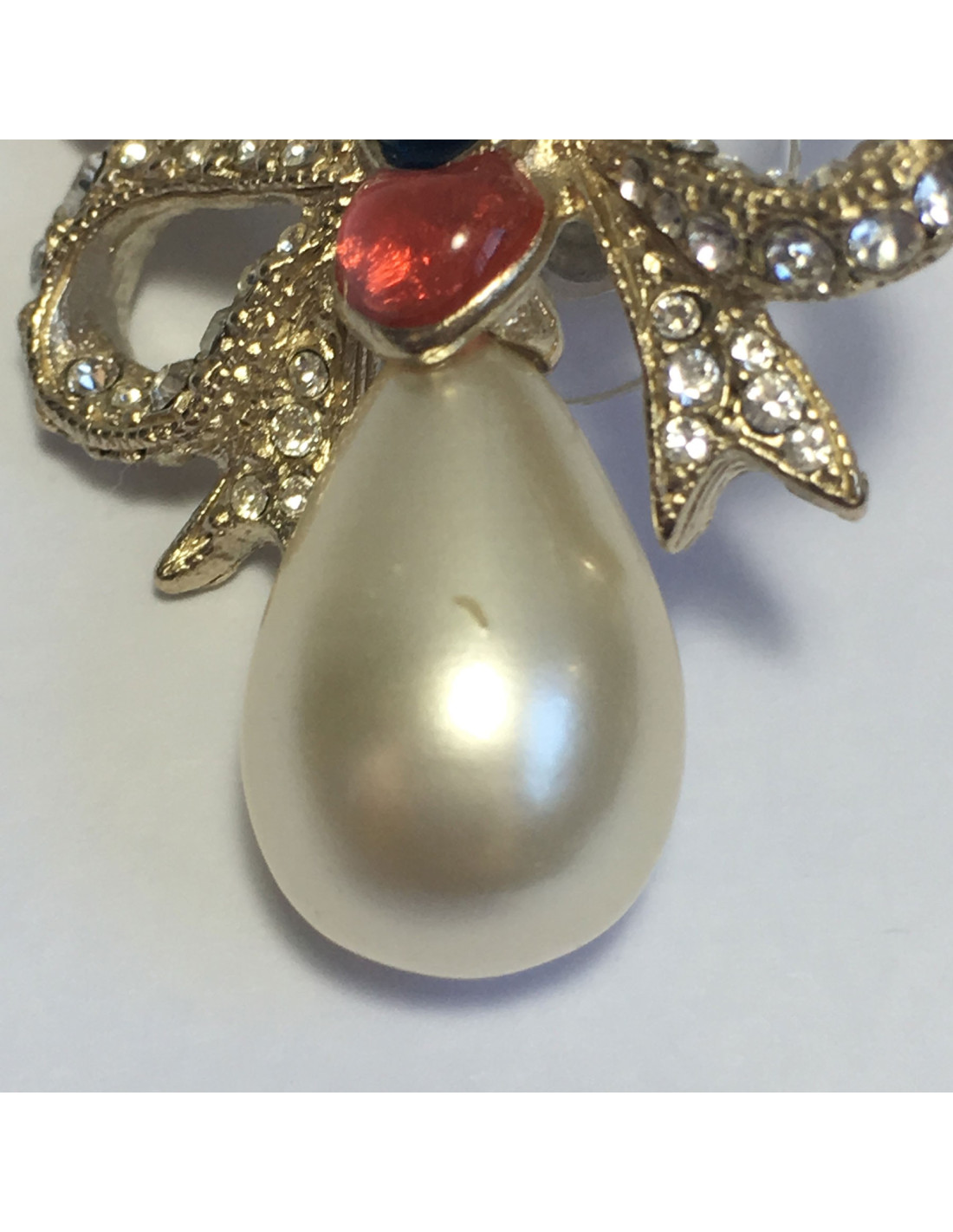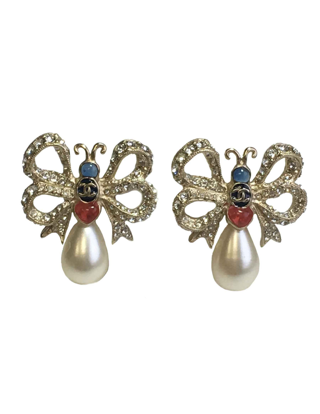 Rare Clous d'oreilles Chanel en forme de papillon orné de strass et de pête de verre bleu et rouge, une perle nacrée en forme de poire finie cette magnifique boucle d'oreille.