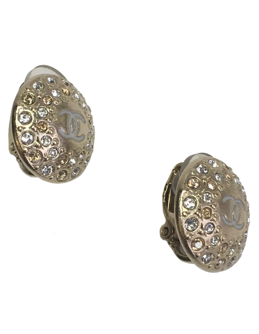 Clips d'oreilles Chanel en métal doré à l'or fin, parés de strass blancs et d'un CC au centre.