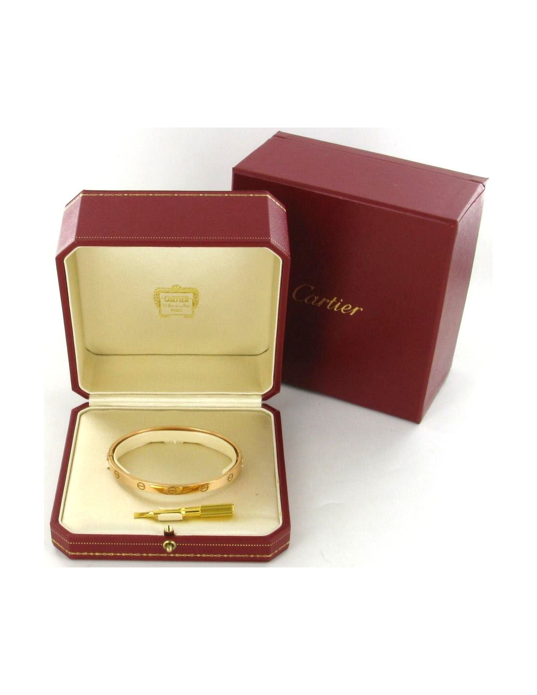 LOVE CARTIER bracelet in 18 carat rose gold, size 18 cm. Pinçon "Cartier 750" and signature "Because...". This bracelet comes in its original jewellery box, accompanied by the Cartier screwdriver, and its box. In very good condition, this bracelet presents only a few non-visible scratches to the naked eye. In order to know your size for this bracelet LOVE, you can find very precise indications on the site of the CARTIER House.