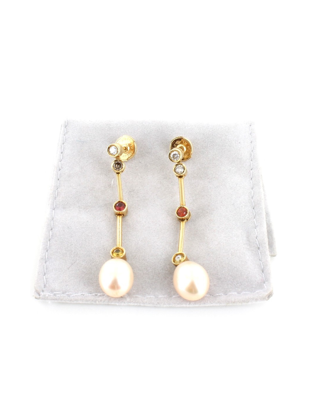 Earrings (nails) CHANEL fine jewelry yellow gold, white pearls of culture, white diamonds, and gems of yellow and orange. This beautiful pair of pierced earrings is articulated. Punch gold 750 18K. CHANEL engraving the clasps. Supplied with a Chanel pochon in felt grey.