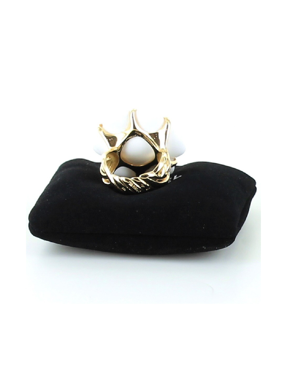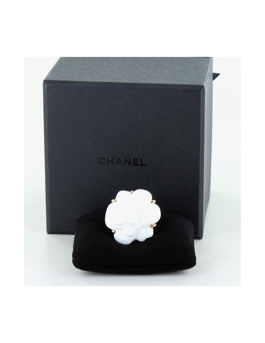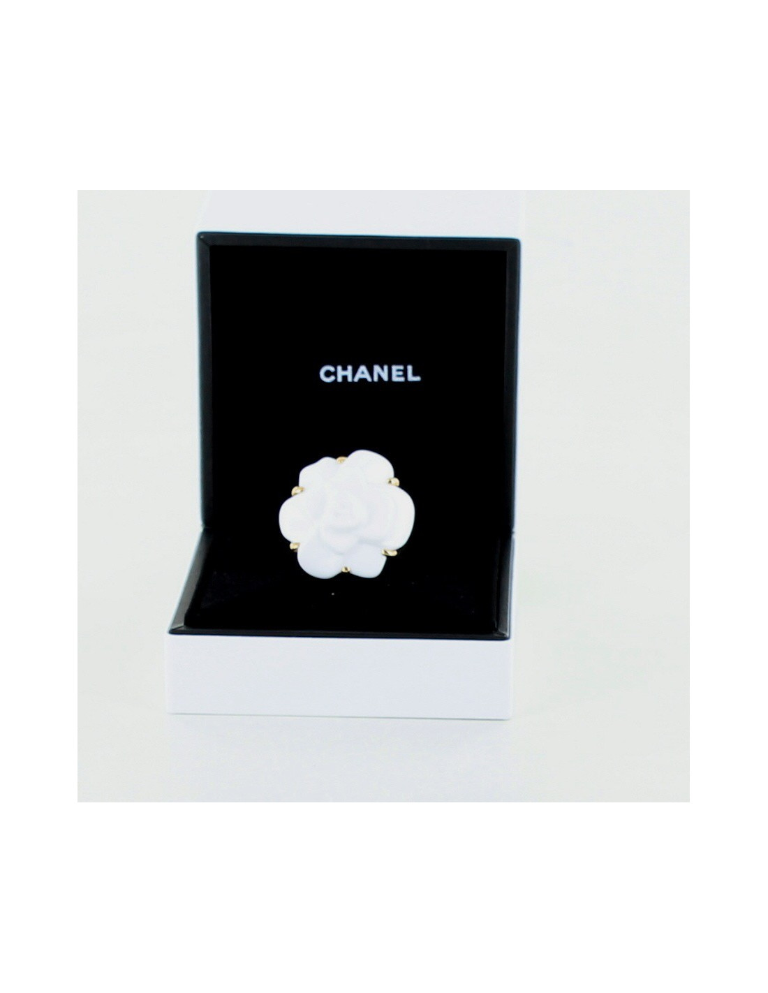 Ring camelia, iconic of the House of Chanel, size 55, Camellia in white, mounted agate on yellow 18 carat 750/1000 gold. Le camelia symbol of the House of Chanel and dear to Mademoiselle Coco