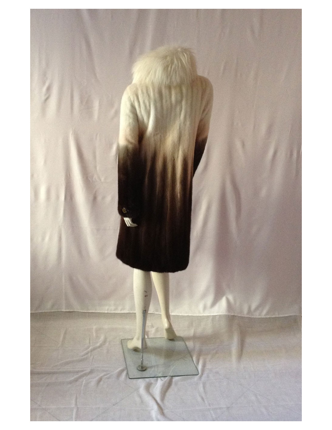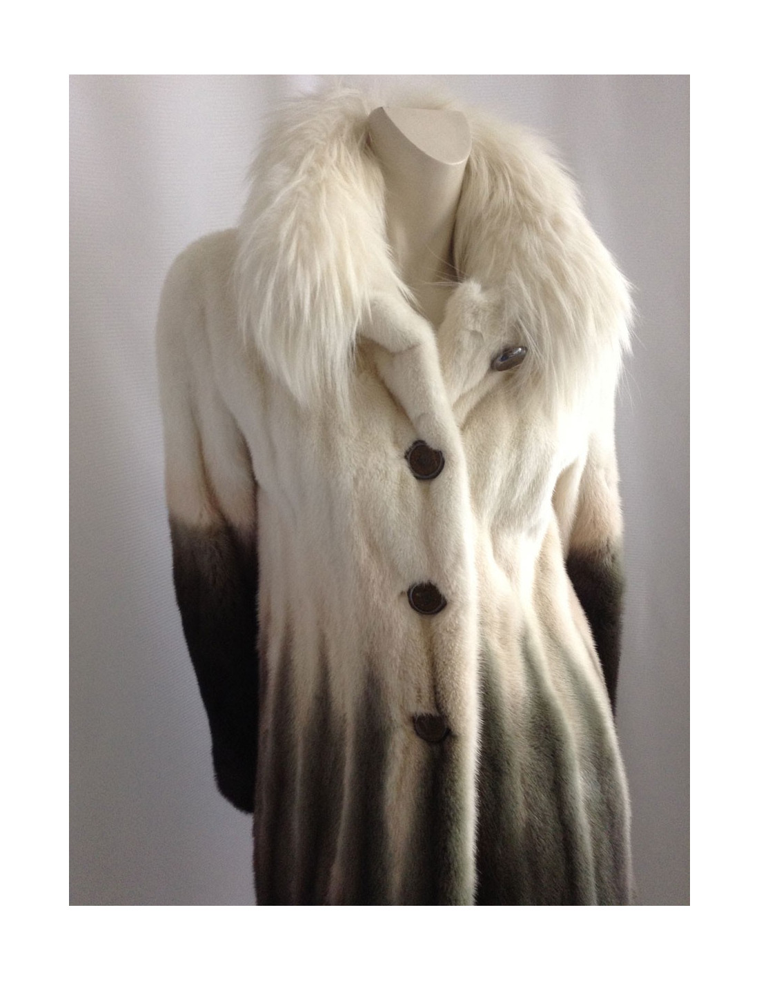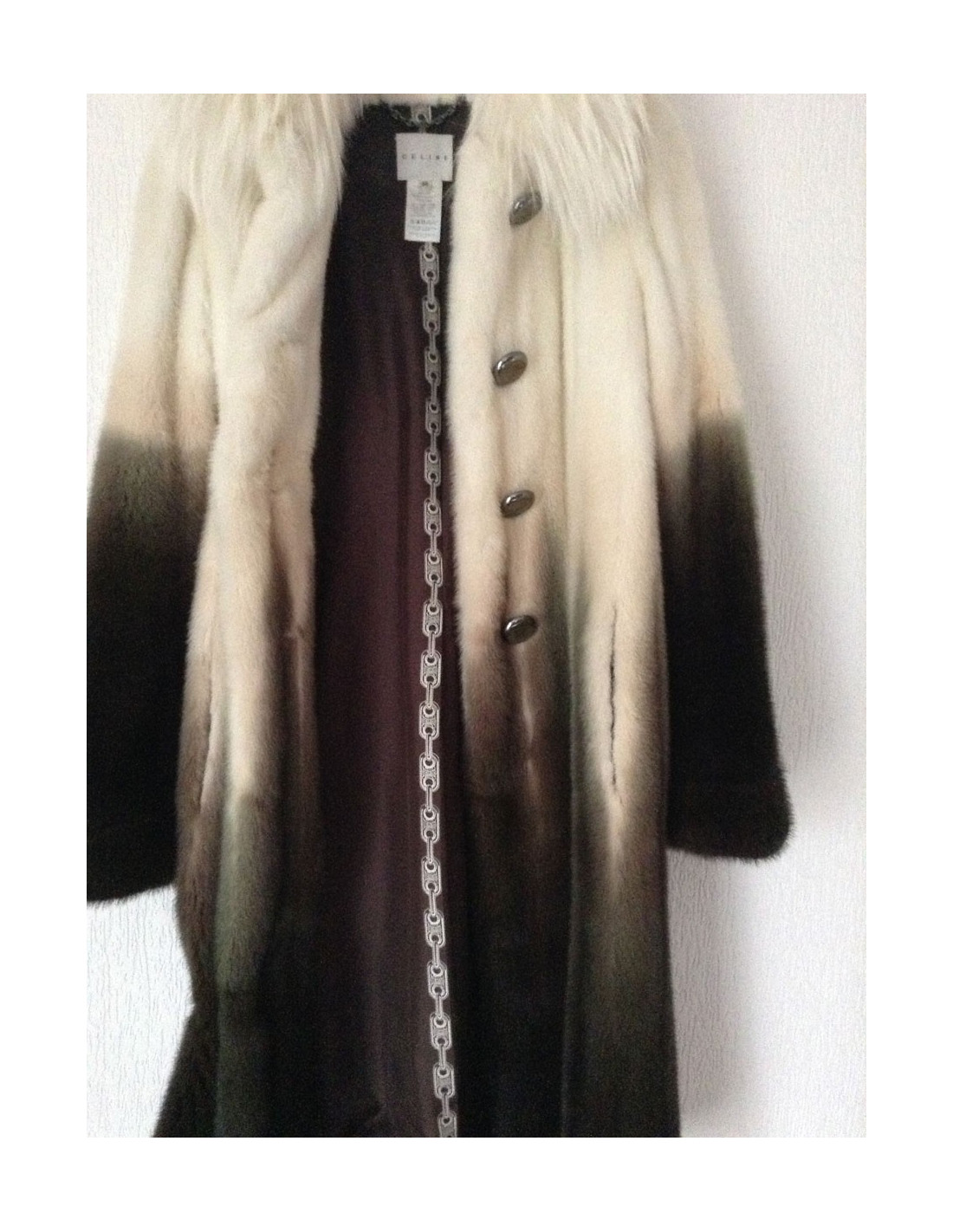 Beautiful coat Céline mink 100%. A very pretty piece. The white collar is Fox; the colors have been harmoniously selected: Brown, Khaki, beige, off-white; the gradient is SUBLIME! The lining is silk 100% Brown monogrammee Céline, THE MUST HAVE!