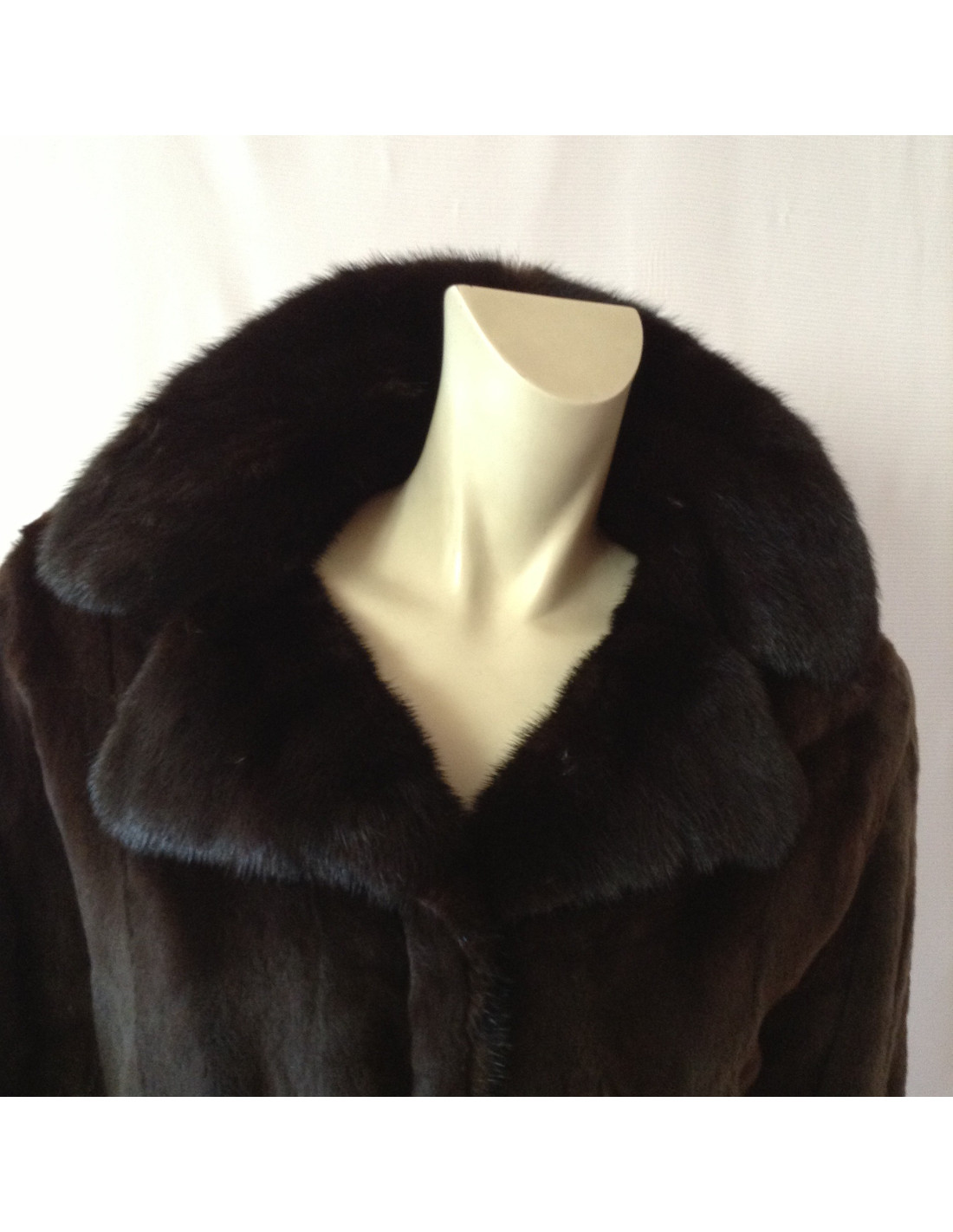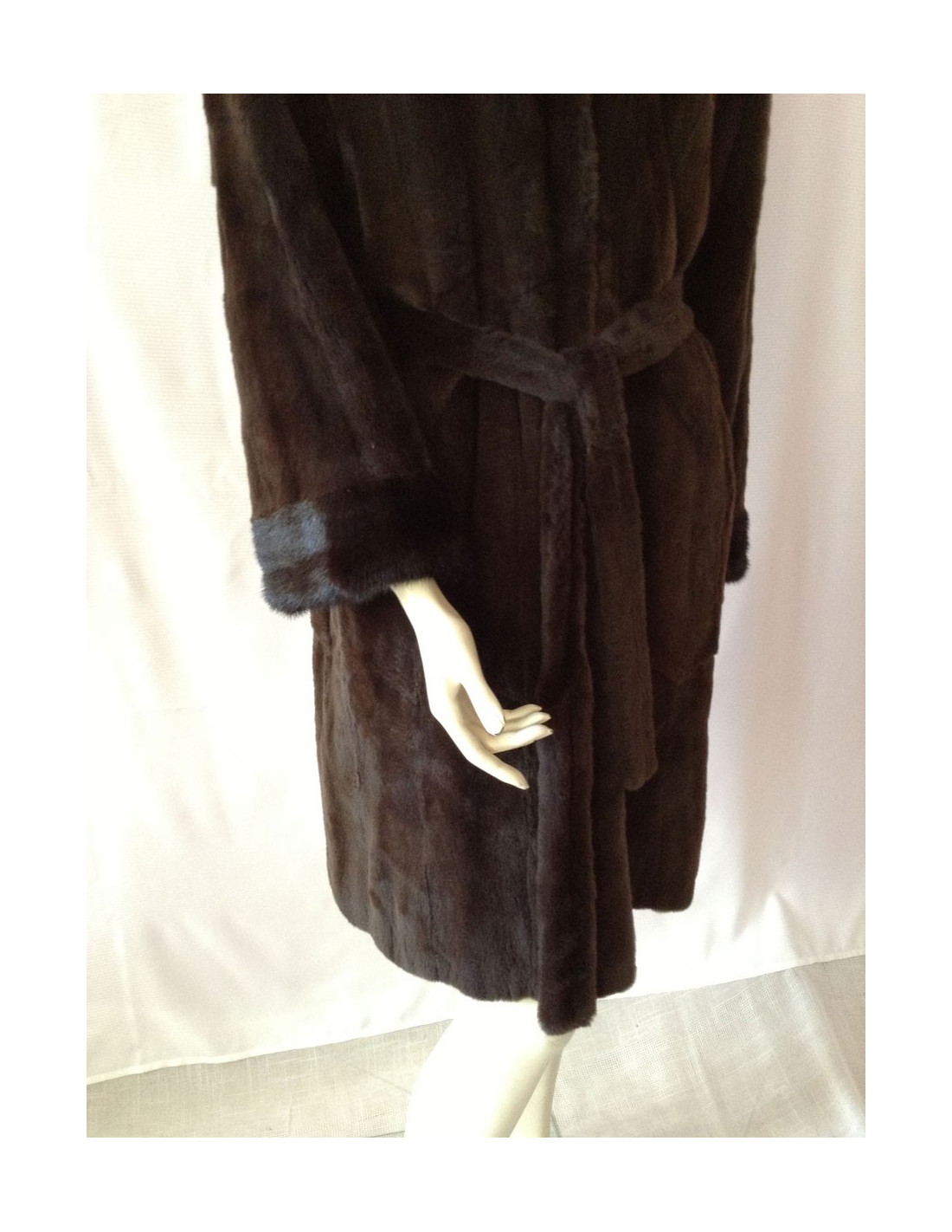 Mink coat shaved Brown with matching belt, collar and sleeves finishes are more Brown dark mink not shaved. This coat size as a 38fr coat without a mark.